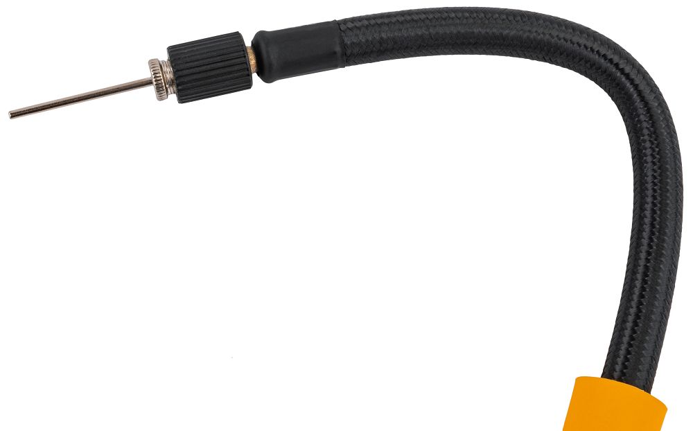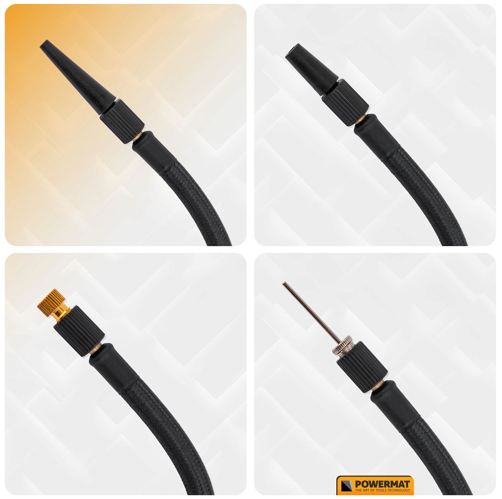 Kompresor je dodávaný so sadou výmenných koncoviek, vďaka čomu môžete nástroj presne prispôsobiť rôznym typom ventilov. Čerpadlo má integrovaný Schraderov ventil umiestnený priamo na hadici, čo umožňuje rýchle a bezpečné pripojenie k štandardným automobilovým ventilom. Vďaka tomu je možné ľahko nafúknuť pneumatiky automobilov a motocyklov.