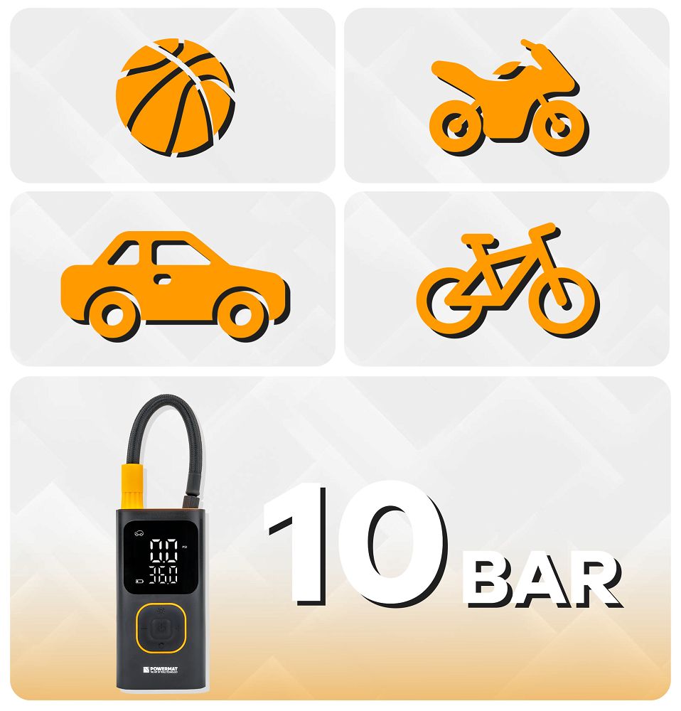 Kompresor je vhodný na nafukovanie pneumatík na osobných automobiloch, SUV, motocyklov, bicykloch a elektrických skútroch, pričom ponúka parametre prispôsobené rôznym typom vozidiel. Funguje tiež perfektne so športovým a rekreačným vybavením, umožňuje rýchlo nahustiť lopty, matrace a nafukovacie príslušenstvo, čo z neho robí univerzálny nástroj pre domáce a cestovné použitie.