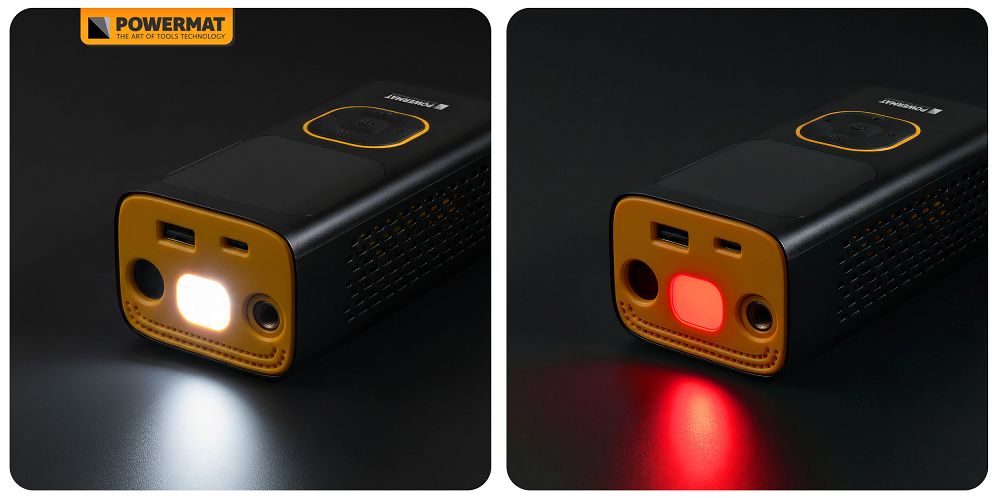 Je vybavený snímačom prehriatia a ochranou proti nesprávnemu tlaku a nesprávnemu nabíjaniu, čo chráni zariadenie aj používateľa. Prispôsobenie na prácu v extrémnych teplotách zvyšuje spoľahlivosť zariadenia v dielni, na ceste aj v teréne. Port USB umožňuje používať zariadenie ako powerbank. LED lampa ponúka režimy nepretržitého svietenia, núdzového svietenia a SOS, čím výrazne zvyšuje funkčnosť kompresora za zhoršených svetelných podmienok.