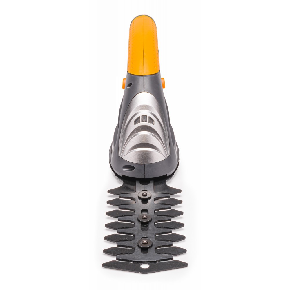 Vďaka rotačnému mechanizmu a tlačidlu na otvorenie spodného krytu môžete nože ľahko vymeniť, aby ste mohli nožnice používať na kosenie kríkov alebo kosenie trávy.
