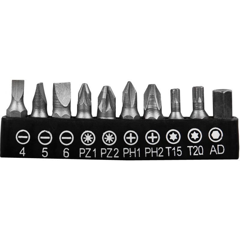 - Skrutkovacie bity (10 ks): PH1, PH2, PH3, PZ1, PZ2, PZ3, SL4, SL5, SL6, SL7