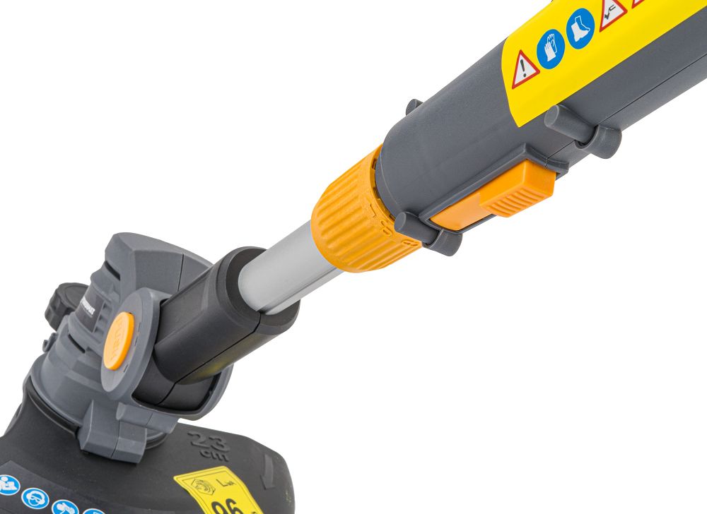 Ďalšou výhodou je nastavenie uhla hlavy vyžínača. Je to mimoriadne praktická funkcia, ktorá výrazne uľahčuje kosenie v ťažko prístupných oblastiach. Nastavením uhla hlavy môže používateľ presne kosiť trávu pozdĺž obrubníkov, pod lavičkami, okolo stromov a tiež na nerovnom teréne.