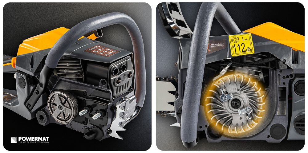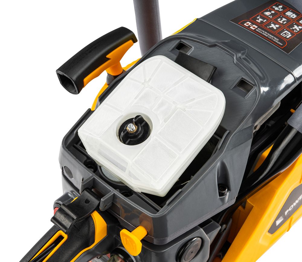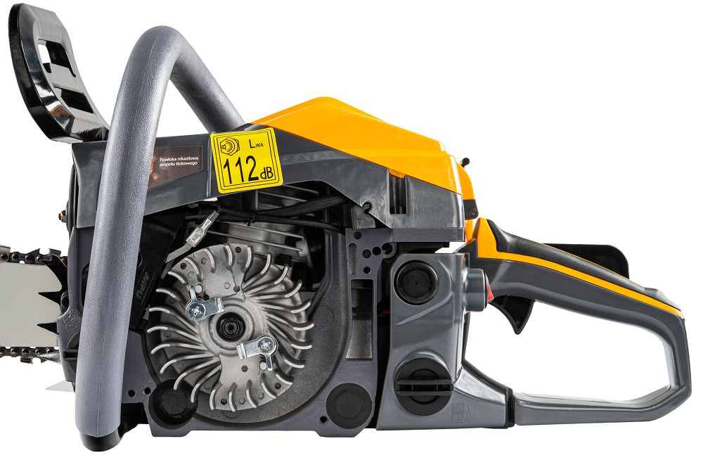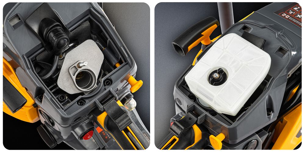 Palivová pumpa (primer) a systém ľahkého štartu urýchľujú naštartovanie zariadenia, najmä pri studenom motore. Antivibračný systém so 6 pružinami znižuje vibrácie aj pri intenzívnej práci, takže sa ruky menej unavia a máte lepšiu kontrolu nad reťazovou pílou. Protišmyková rukoväť zvyšuje stabilitu pri dlhšej práci a bezpečnosť pri rezaní. Nikasilová úprava valca a piesta zvyšuje odolnosť proti opotrebeniu a predlžuje životnosť motora.