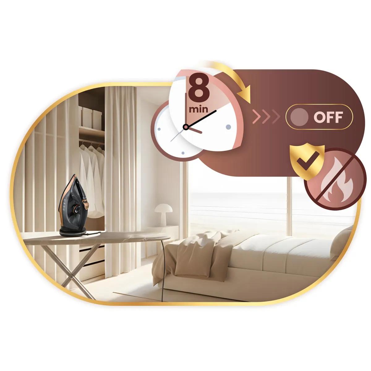 Bezpečnosť je zabezpečená automatickým vypnutím po niekoľkých minútach nečinnosti a systémom proti prehriatiu či kvapkaniu. Vďaka kombinácii bezkábovej prevádzky, výkonu, keramickej platne a bezpečnostných funkcií je táto žehlička praktickým a spoľahlivým pomocníkom pre domácnosť.