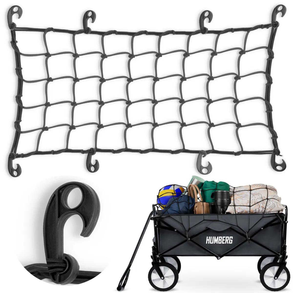 Bezpečnostná sieť pre vozíky, 90x52cm | Humberg slúži na pevné zabezpečenie nákladu počas pohybu a má 8 háčikov pre stabilnú montáž. Je vyrobená z pevného, elastického materiálu a vďaka háčikom na pripevnenie dokonale chráni pred vypadnutím predmetov pri jazde aj po nerovnom teréne. Vďaka univerzálnemu dizajnu a veľkosti je vhodná pre mnoho modelov vozíkov Humberg a iných vozíkov s kompatibilnými rozmermi. Hodí sa pre HM-511, HM-512, HM-513.