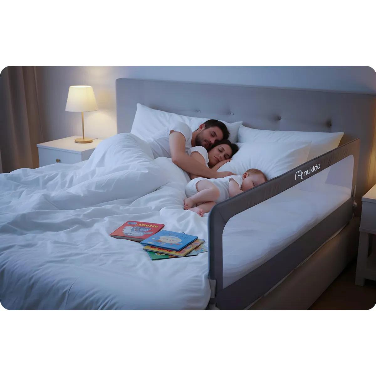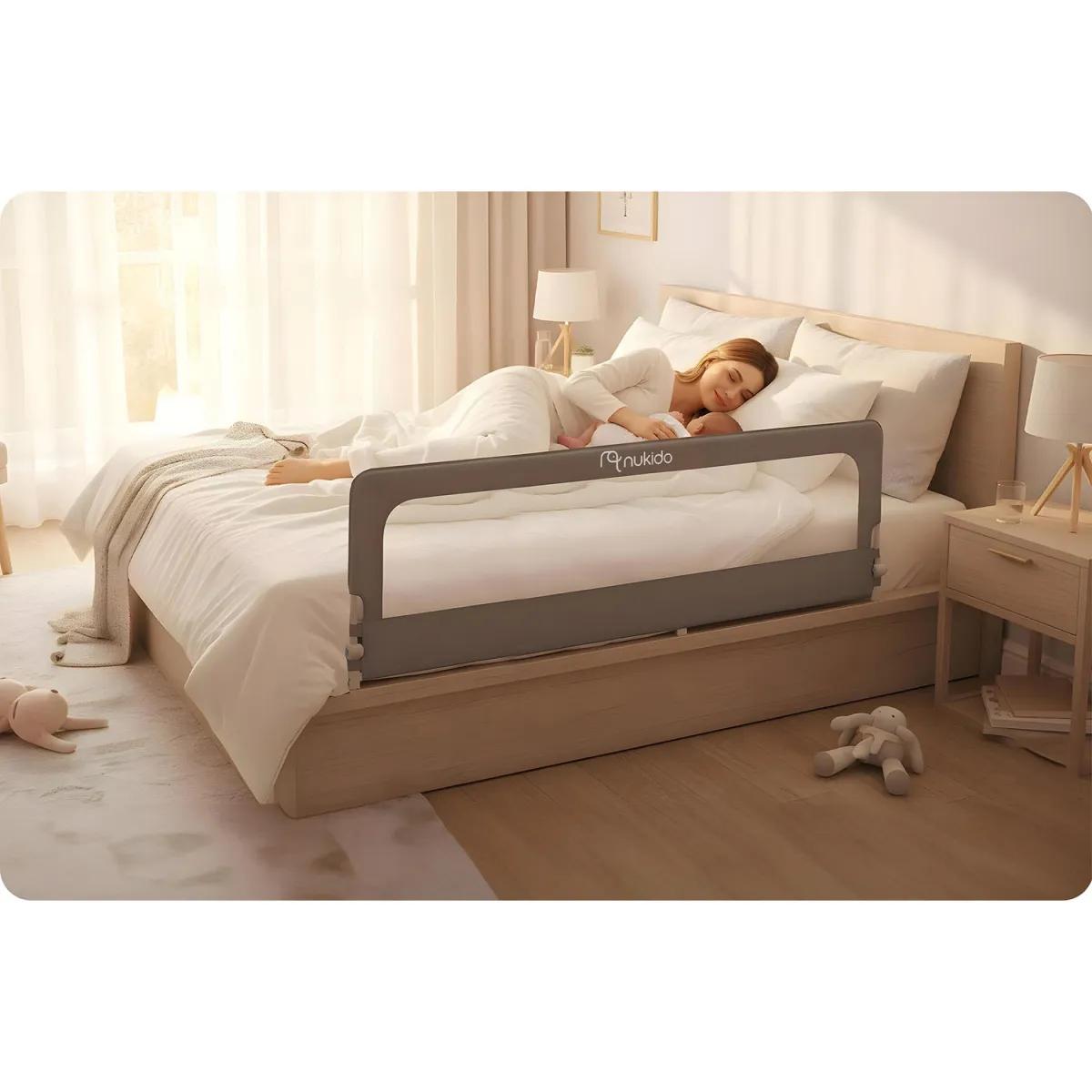 Bezpečnostná zábrana na posteľ NK-228, 200cm, sivá | Nukido účinne chráni pred pádmi, poskytuje vášmu dieťaťu slobodu a vám istotu, že je v bezpečí. Konštrukcia kladie dôraz na stabilitu a jednoduchú montáž – zábrana sa pevne upevňuje k rámu postele bez potreby zložitých nástrojov a odolné materiály zabezpečujú dlhodobé používanie.