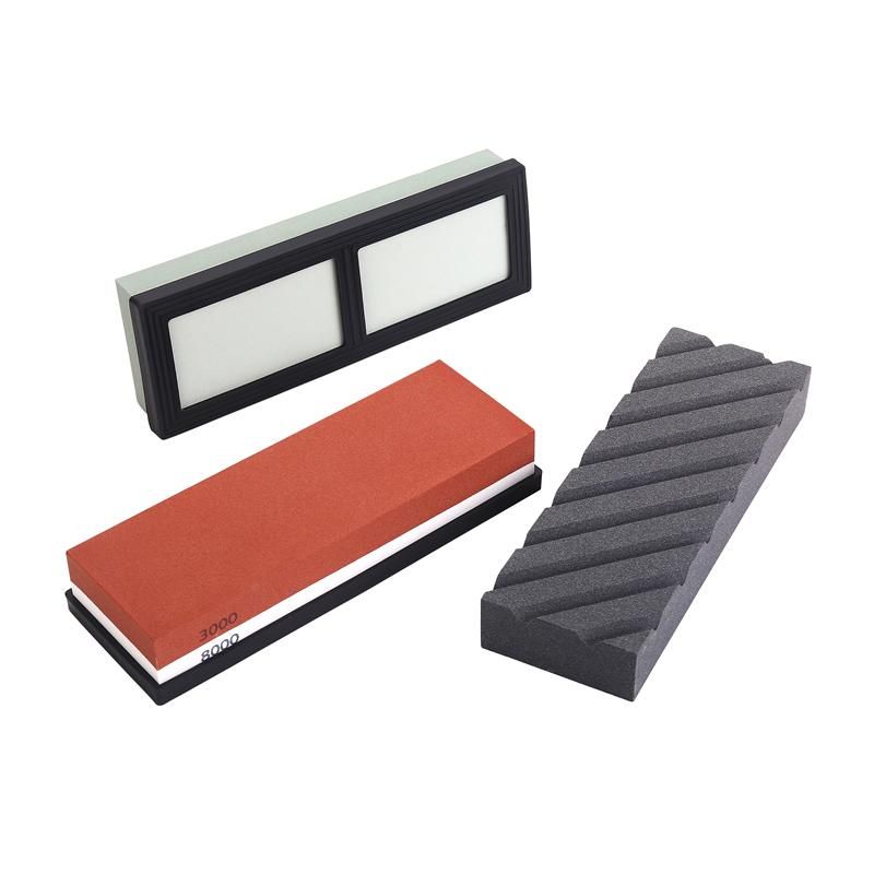 Brúsne kamene na nože | KD11271 je praktická sada na brúsenie rôznych typov nožov, kuchynských nástrojov, sekier, dlát či nožníc. Vďaka rôznorodému stupňovaniu brúsnych plôch umožňuje rýchle hrubé brúsenie aj presné vyhladenie rezných hrán. Kamene sú vyrobené z odolného brúsneho materiálu, ktorý zaručuje dlhú životnosť a efektívne brúsenie bez potreby použitia ďalších chemikálií. Protišmyková základňa stabilizuje brúsny kameň počas používania, čím zvyšuje bezpečnosť a komfort. Sú nepostrádateľné v každej kuchyni, dielni alebo domácnosti – všade tam, kde je dôležitá ostrosť a presnosť.