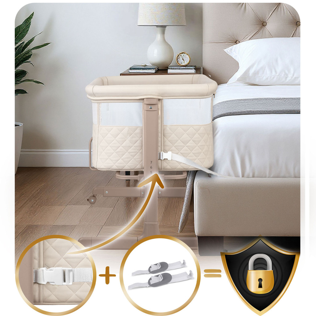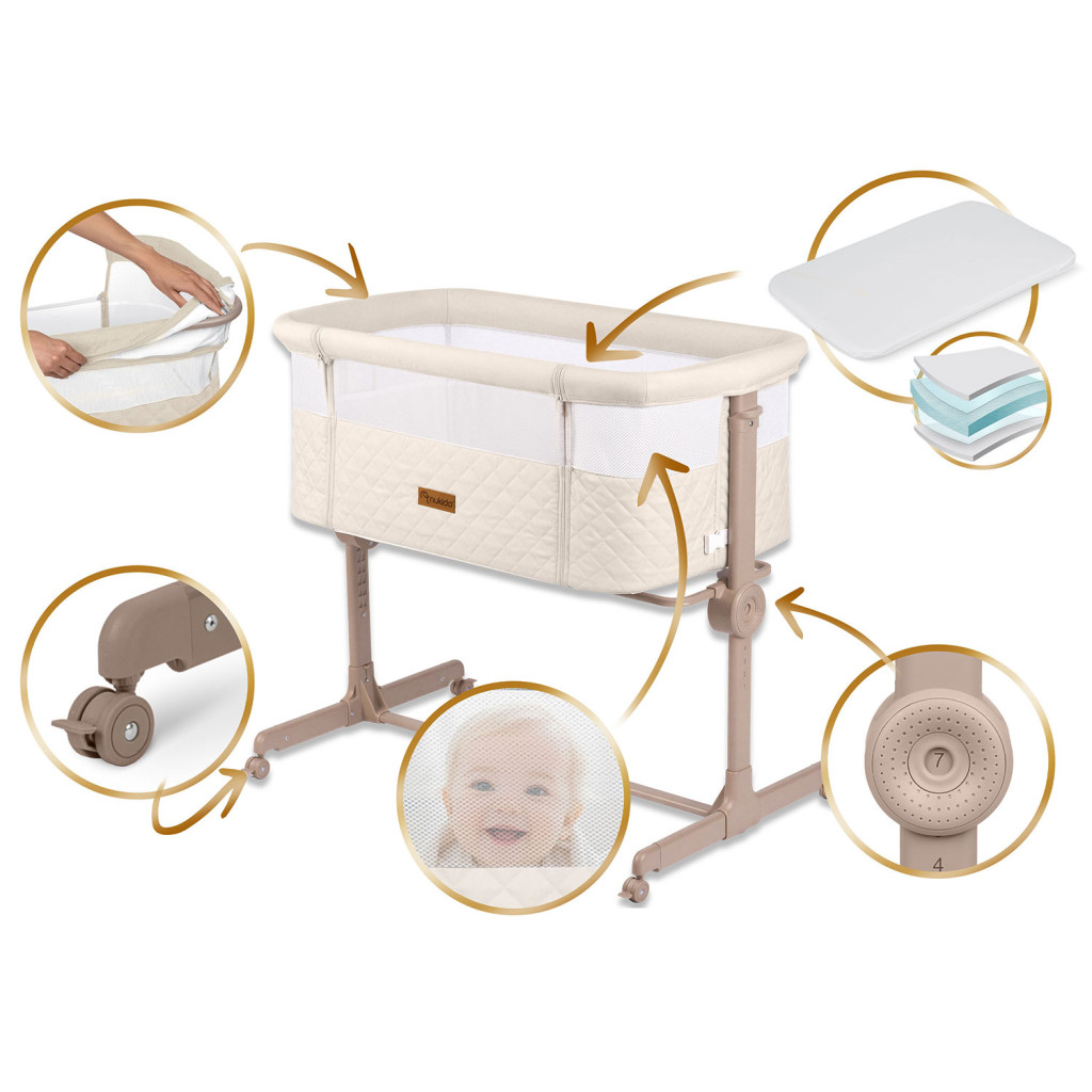 Stabilná konštrukcia zaisťuje bezpečnosť, zatiaľ čo 4 kolieska s brzdou umožňujú presúvanie bez námahy. Bočný prístup je odnímateľný a uzamykateľný, aby dieťa nemohlo samo vyjsť, a poťahy aj látkové časti sú odnímateľné a prateľné, čo uľahčuje údržbu. Súčasťou balenia je aj matrac s odnímateľným poťahom, ktorý zabezpečuje pohodlie pre dieťatko.