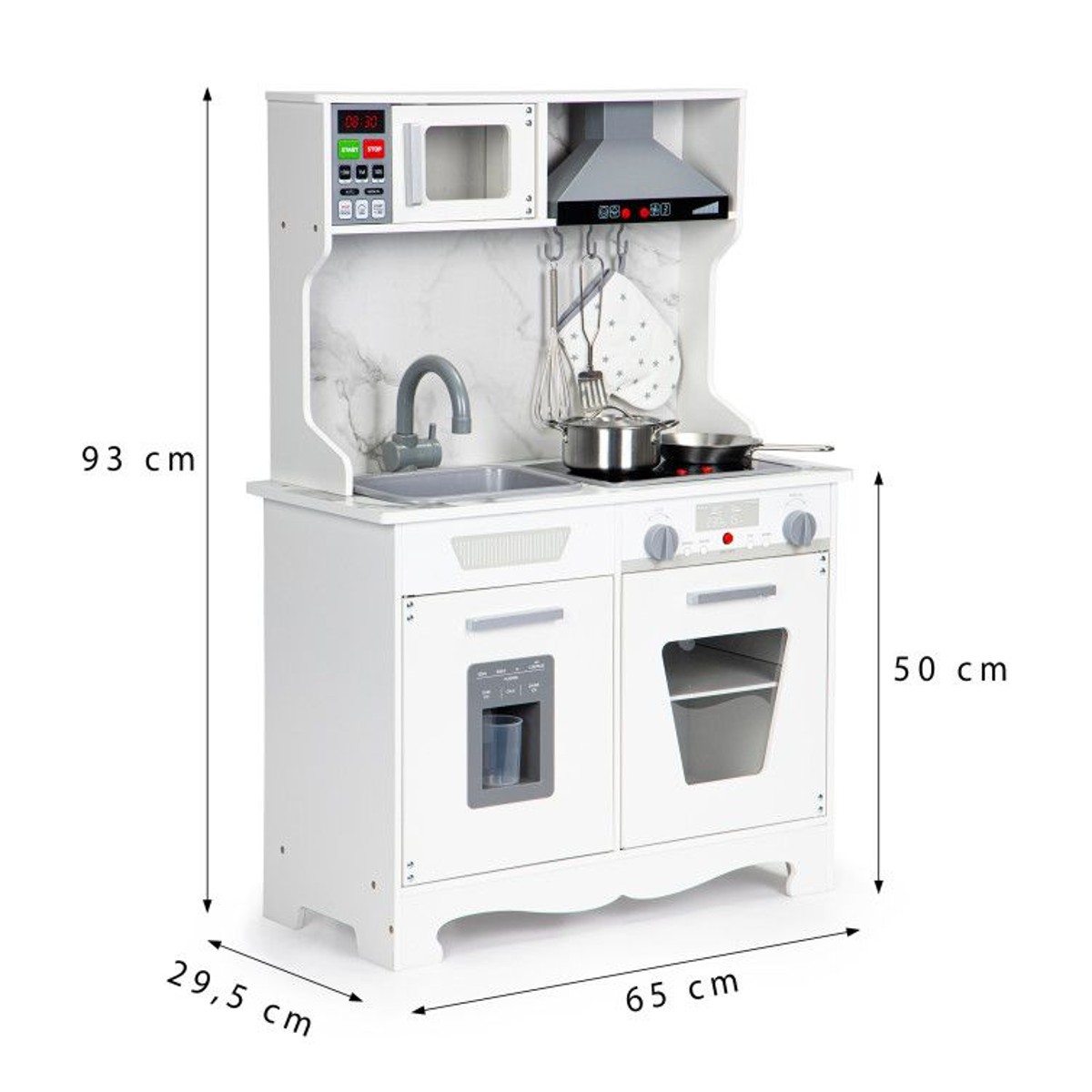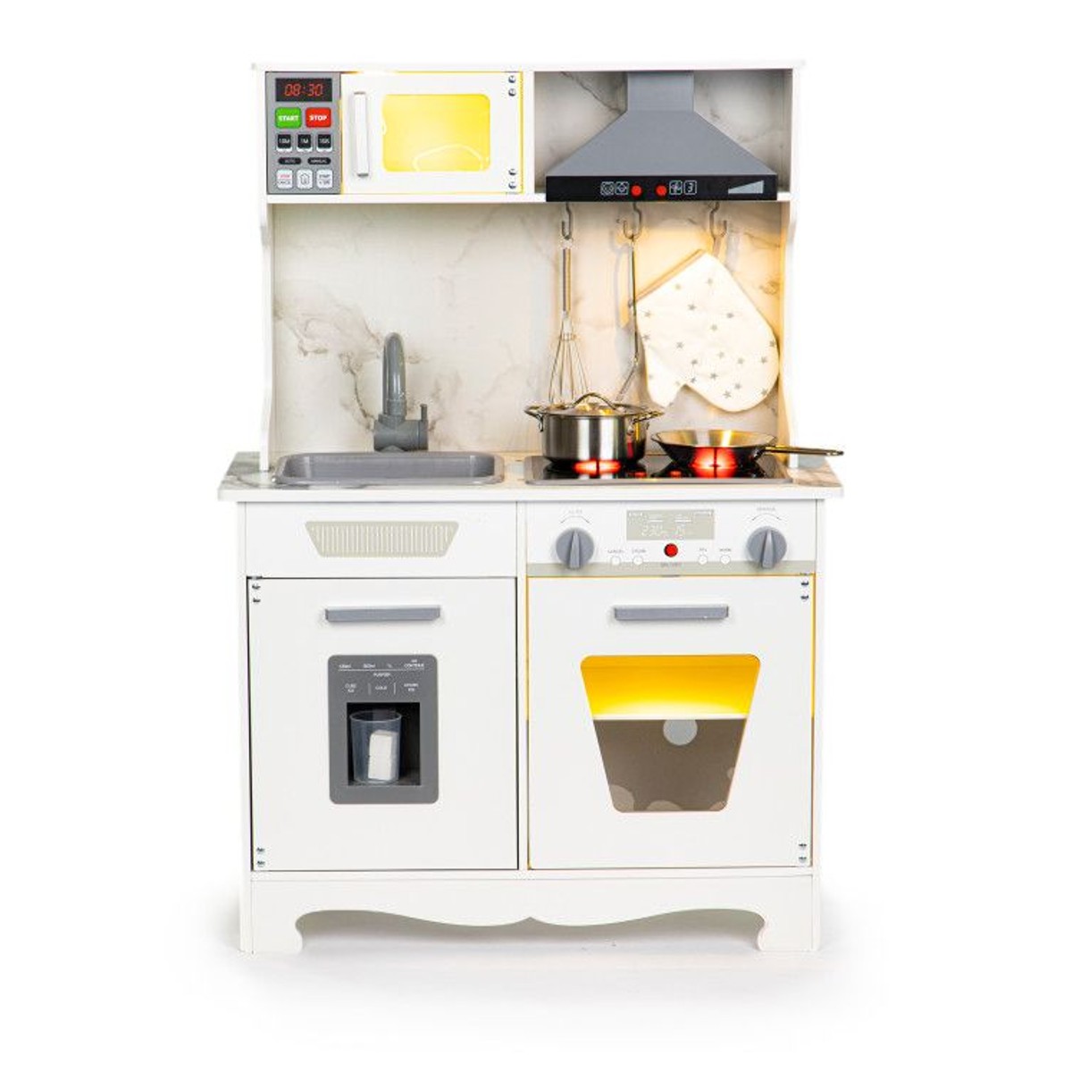 Detská drevená kuchynka s LED osvetlením | + doplnky – deti milujú hračky, vďaka ktorým sa cítia ako dospelí, ktorí vykonávajú svoje každodenné povinnosti a radi napodobňujú ich správanie. Táto forma hry má nepochybne pozitívny vplyv na rozvoj dieťaťa a rozvíja fantáziu a manuálne zručnosti. Vďaka ECOTOYS sa deti budú môcť zahrať na kuchára a zábava pri príprave jedál pre celú rodinu bude nekonečná. Ďalšie svetelné a zvukové efekty prenesú vaše dieťa do sveta kulinárskeho dobrodružstva.