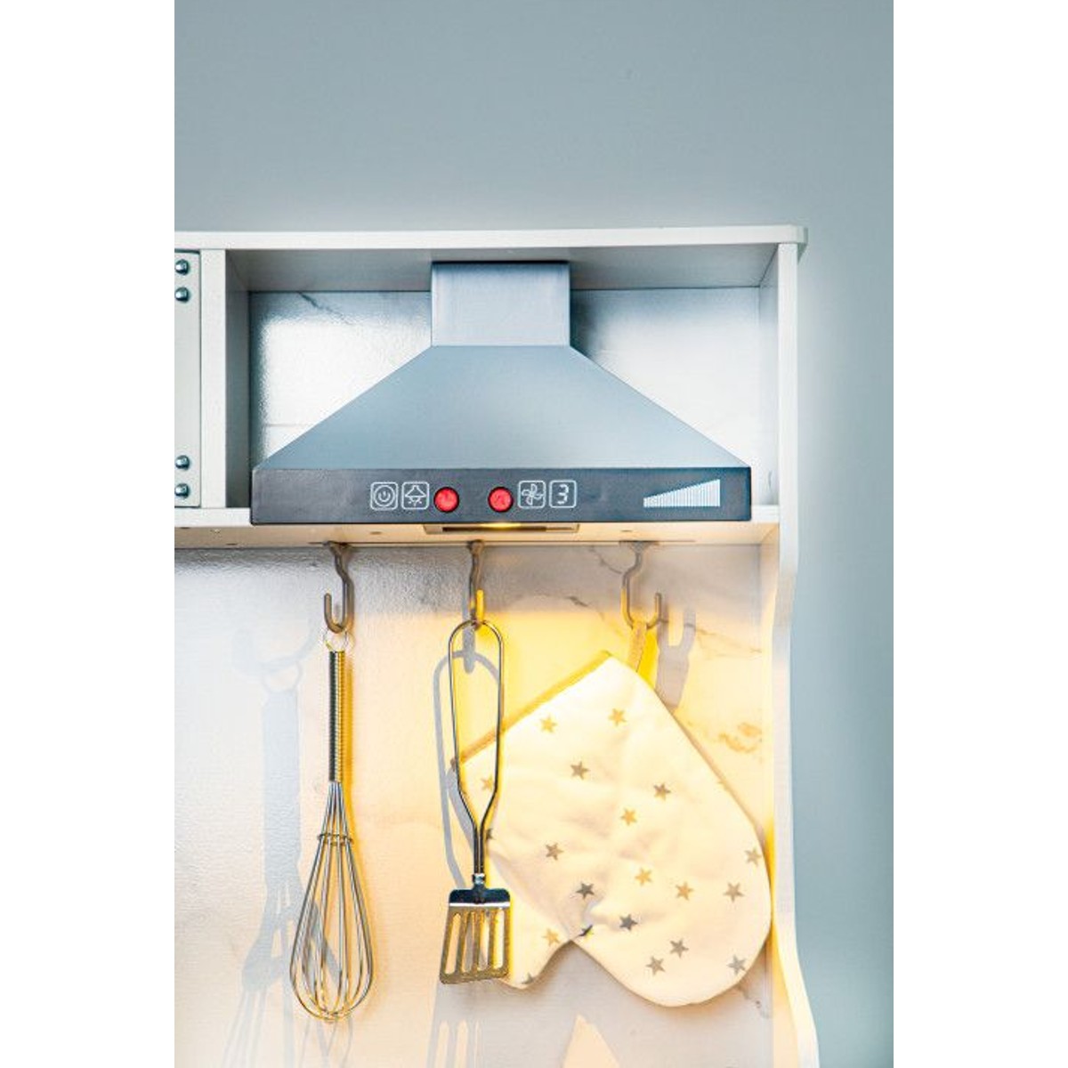Ako v skutočnej kuchyni je nad horákmi digestor, ktorý má podsvietenie a vydáva charakteristický zvuk bežiaceho ventilátora.