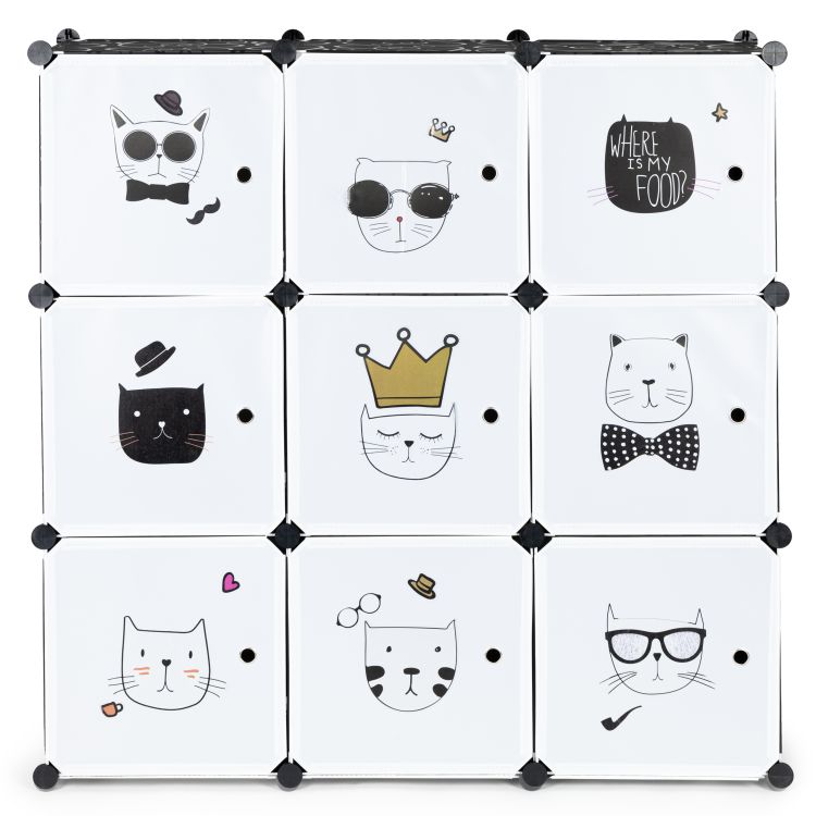 Každá z 9 políc unesie až 3 kg, takže umožňuje uložiť knihy, plyšové hračky aj stavebnice a vďaka ľahkému prístupu si deti môžu samy udržiavať poriadok. Skriňa má ľahko otvárateľné dvierka s farebnou grafikou rozprávkových postáv, zvierat alebo iných motívov, ktoré oživia detskú izbu. Montáž je jednoduchá vďaka spojovacím prvkom z odolného ABS materiálu a konfiguráciu môžete podľa potreby upraviť.