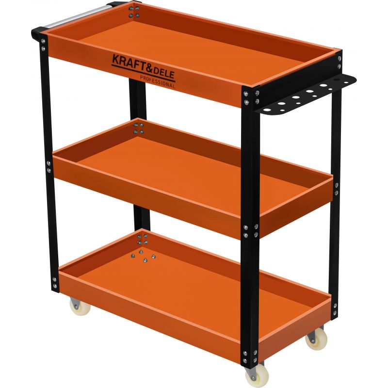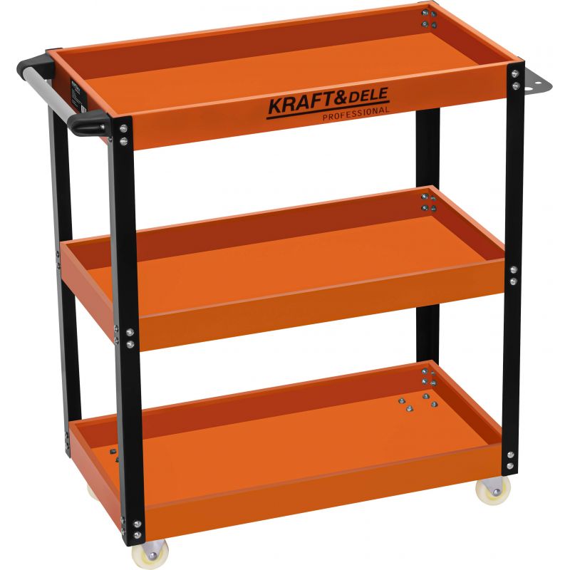 Dielenský vozík, 3 police | KD1092 je pevný a funkčný dielenský vozík, navrhnutý s ohľadom na pohodlné usporiadanie náradia a príslušenstva na pracovisku. Výborne sa osvedčí v dielni, garáži, servise a pri mobilných prácach, kde záleží na rýchlom prístupe k vybaveniu. Vozík je vybavený tromi priestrannými policami so zvýšenými okrajmi, ktoré zabraňujú skĺznutiu náradia pri presúvaní.