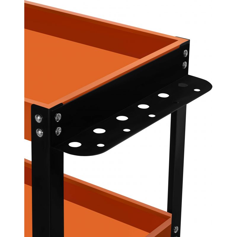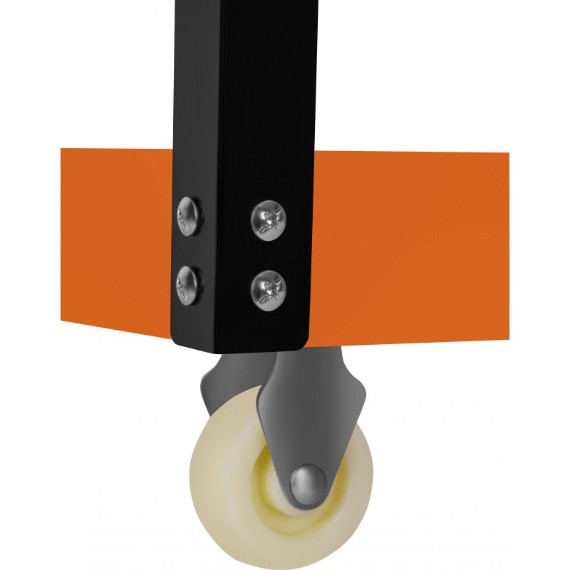 Stabilná oceľová konštrukcia zaisťuje odolnosť a schopnosť znášať zaťaženie, zatiaľ čo štyri transportné kolieska umožňujú plynulé presúvanie vozíka po rôznych povrchoch. Ďalšou výhodou je ergonomická prepravná rukoväť a bočná lišta s otvormi, ktorá umožňuje zavesenie náradia. Kompaktná konštrukcia a premyslené usporiadanie prvkov robia vozík pohodlným na používanie a umožňujú udržiavať poriadok na pracovisku.