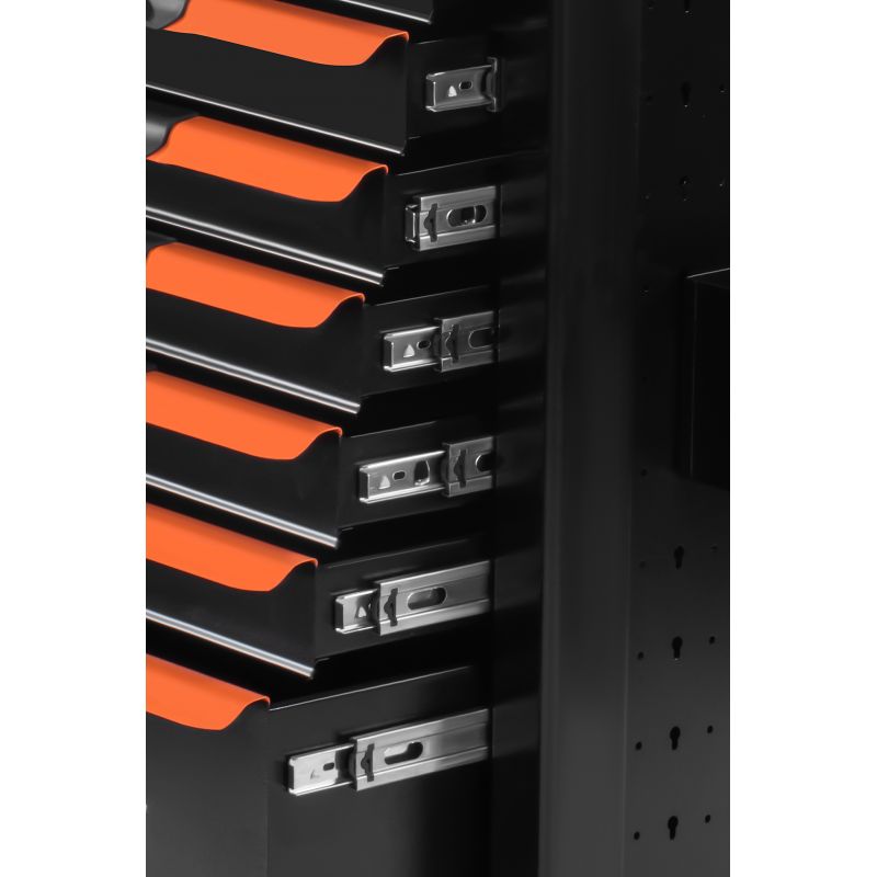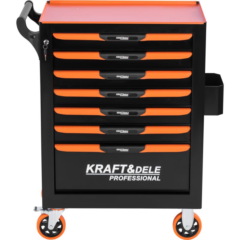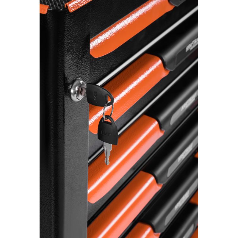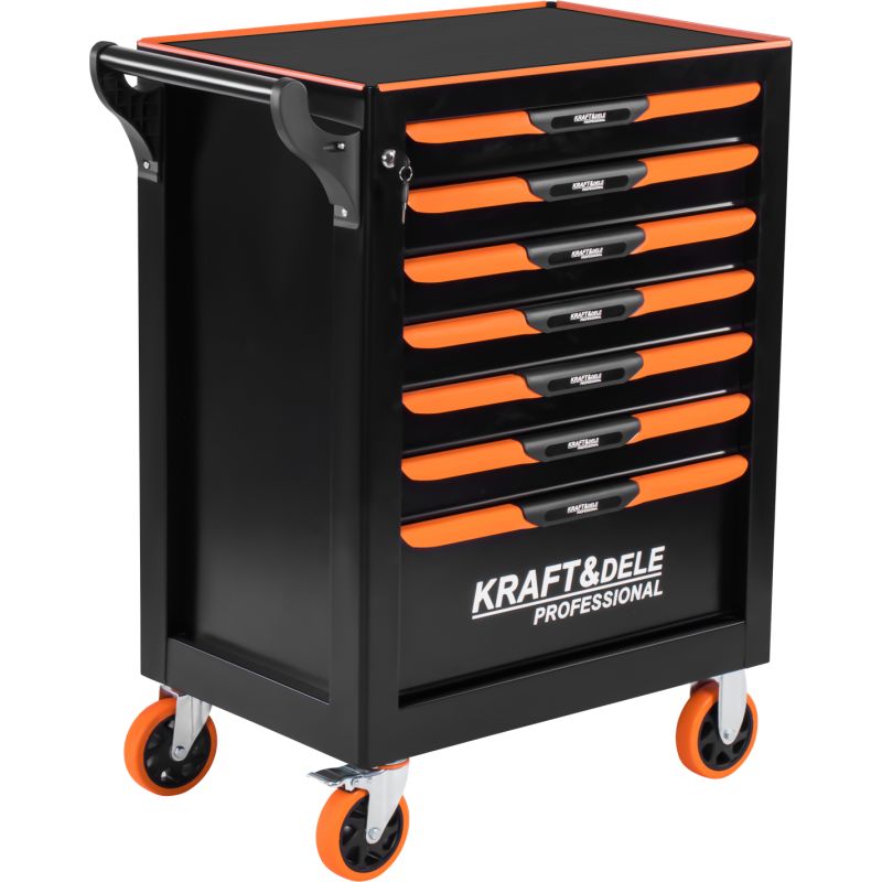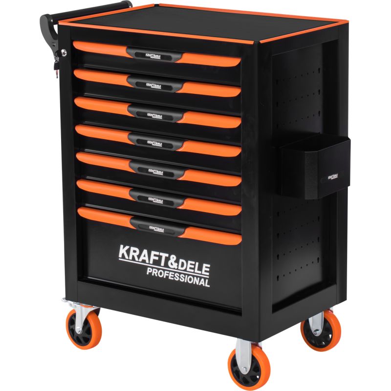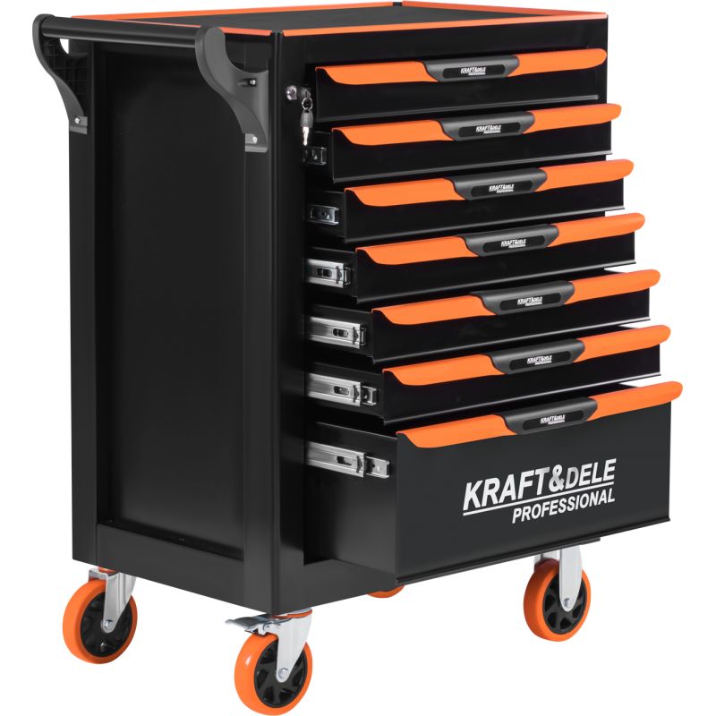 Dielenský vozík, 7 zásuviek | KD1079 je praktický úložný box na organizované uskladnenie náradia a pomôcok v dielni, garáži alebo servise. Je vybavený 7 priestrannými zásuvkami s penovou výstelkou, ktoré zaručujú poriadok a bezpečnosť vášho príslušenstva. Vďaka odolnej oceľovej doske a uzamykateľným kolieskam je ideálny do každej dielne. Jeho konštrukcia zaručuje jednoduché používanie – centrálny zámok chráni obsah a bočná polica umožňuje uloženie ďalšieho príslušenstva.