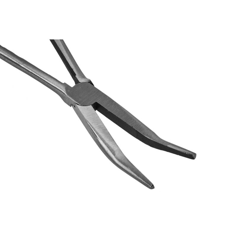 Dlhé zahnuté kliešte, 20° | KD10815 sú užitočný ručný nástroj na manipuláciu a držanie materiálov pri rôznych dielenských a opravárenských prácach. Uľahčujú uchopovanie, držanie, ohýbanie či manipuláciu s drôtmi, skrutkami a ďalšími materiálmi, ktoré sa nachádzajú v ťažko dostupných alebo stiesnených priestoroch.