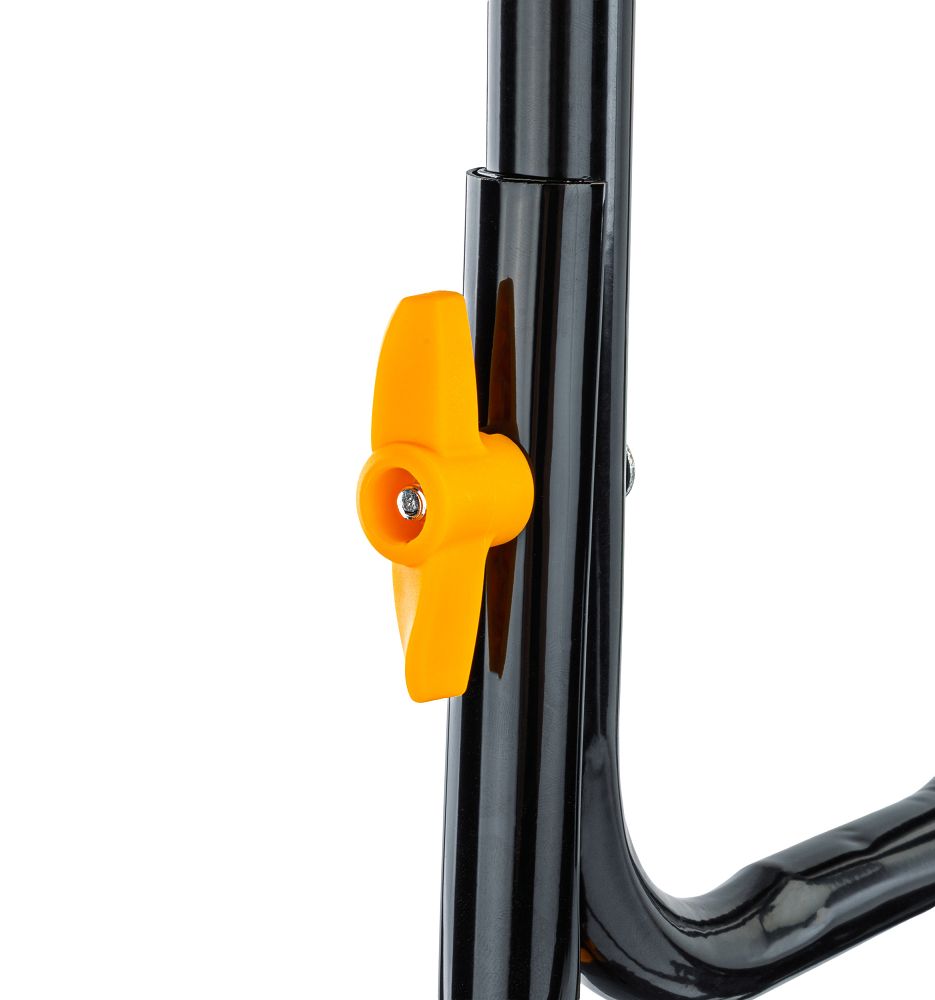 Zariadenie má ergonomicky navrhnuté rukoväte, ktoré zvyšujú komfort používania a znižujú únavu. Optimálny rozstup rukovätí umožňuje presné a prirodzené manévrovanie, čo uľahčuje dlhodobú prácu v záhrade. Okrem toho má rukoväť háčik na zavesenie napájacieho kábla. Celá konštrukcia sa ľahko montuje vďaka použitiu motýľových matíc, čo výrazne urýchľuje demontáž zariadenia na skladovanie mimo sezóny. Všetky rezné prvky sú chránené pevným krytom, ktorý zvyšuje bezpečnosť pri používaní za všetkých podmienok.