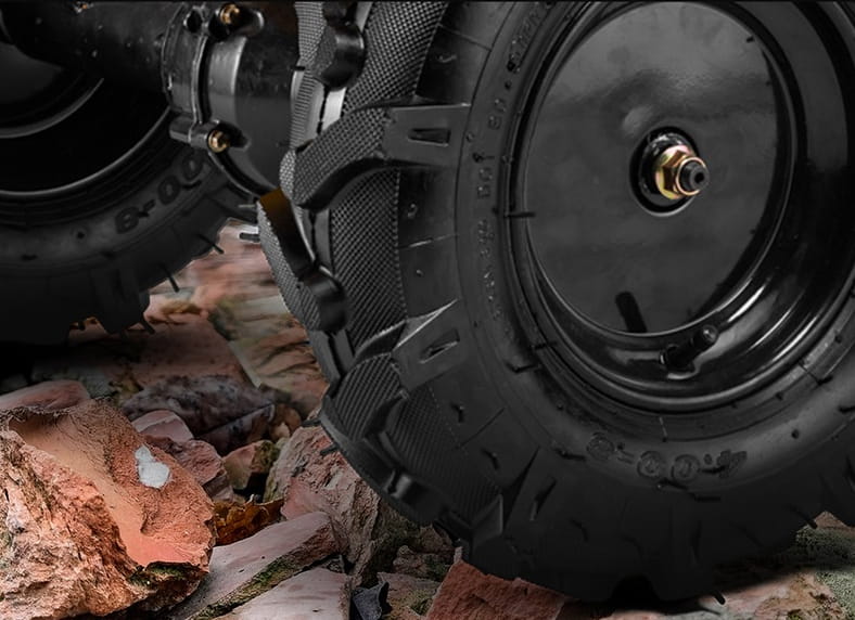 - Robustné kolesá: predné kolesá 16” s hlbokým dezénom V zabezpečujú vynikajúcu trakciu v náročnom teréne