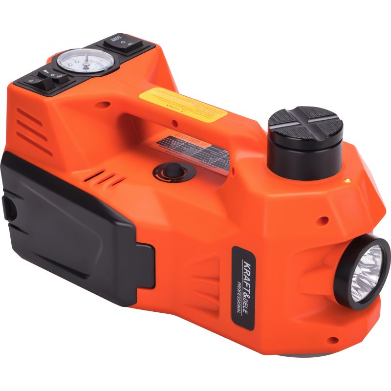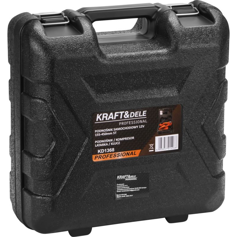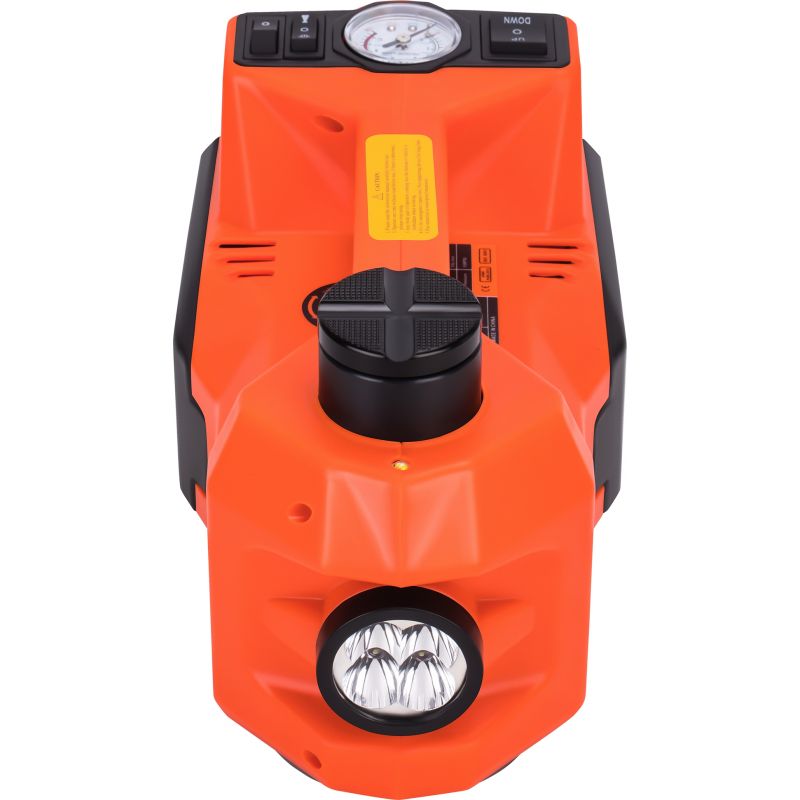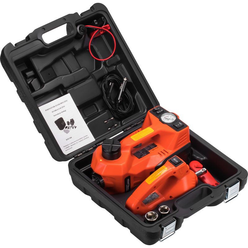 Elektrický zdvihák na autá s kompresorom | KD1368 umožňuje rýchle a jednoduché zdvihnutie vozidla pri výmene kolies alebo servisných prácach. Je to kompletná sada pre automobily, ktorá kombinuje elektrický hydraulický zdvihák, baterku, manometer, automatický kľúč na kolesá a vstavaný kompresor. Je to ideálne riešenie pre vodičov, ktorí chcú byť pripravení na každú situáciu na ceste – od výmeny kolesa po drobné opravy.