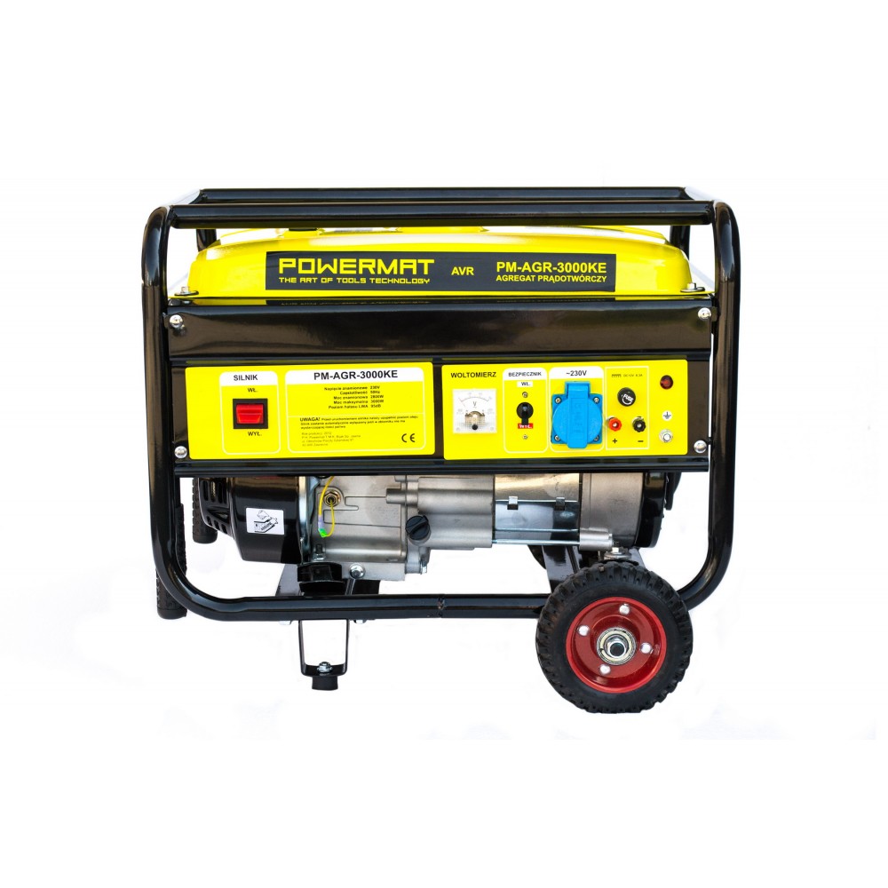 GENERÁTOR PRÚDU – Elektrocentrála s kolesami 230V / 12V Powermat PM-AGR-3000KE generuje 230V (1 zásuvka) a 12V DC. Je výborným riešením nedostatku elektriny v teréne alebo na chalupe. Vybavená voltmetrom a poistkami. Jednotka má snímač hladiny oleja, ktorý automaticky vypne motor, pokiaľ je hladina príliš nízka. Má približný indikátor úrovne hladiny benzínu. Je poháňaná štvortaktným motorom s jedným valcom s objemom 196 ccm. Jednotka sa spúšťa pomocou ručného štartovania lankom. Gumové tlmiče sa veľmi dobre znižujú, prenášajú vibrácie z motora na skriňu jednotky. Agregát je poháňaná štvortaktným OHV motorom s výkonom 7KM. Vďaka vysokému výkonu motora si jednotka udržiava svoje otáčky aj pri vysokom zaťažení. Masívne gumové kolieska sú vybavené guľkovými ložiskami, ktoré zaručujú nízky valivý odpor a zvyšujú životnosť.