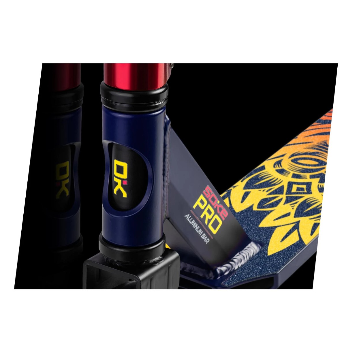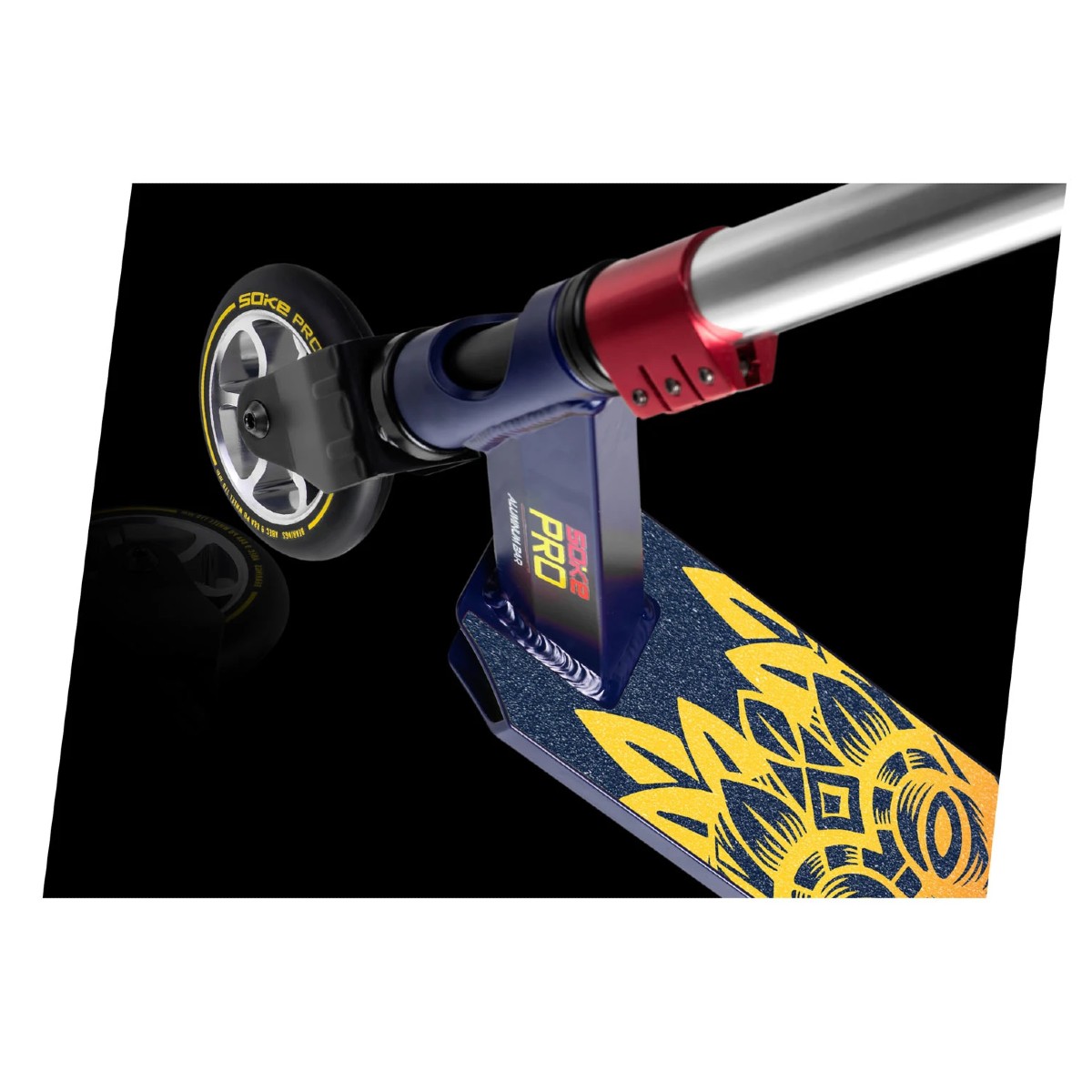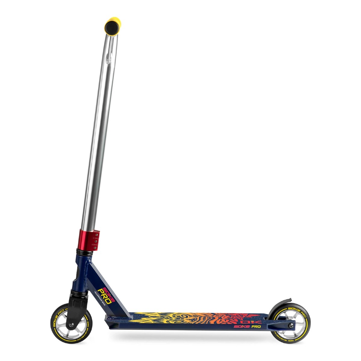 Freestyle kolobežka Soke Pro | modro-červená má kvalitné ABEC-9 ložiská, brzdový systém Flex Fender a rukoväte TPR široké 145 mm.