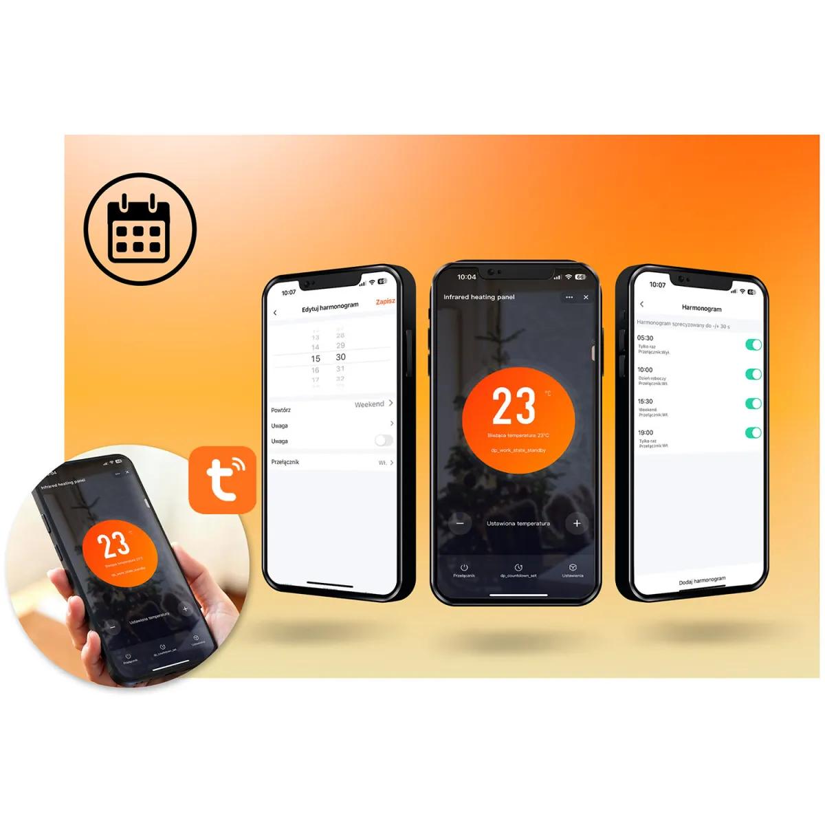 S aplikáciou Tuya Smart vo vašom telefóne, pripojenou k panelu prostredníctvom bezdrôtovej siete Wi-Fi, môžete ľahko ovládať kúrenie vo vašej domácnosti odkiaľkoľvek. S touto aplikáciou môžete ľahko meniť nastavenia, regulovať teplotu a časovač a naplánovať prevádzku, čo vám umožní prispôsobiť podmienky vašim potrebám. Toto flexibilné riešenie poskytuje pohodlie a úsporu energie tým, že umožňuje inteligentné riadenie kúrenia.