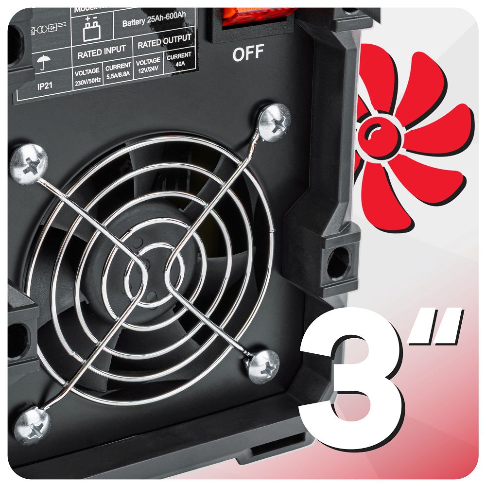 Režim štartu dodáva až 400 A v okamihu otočenia kľúča, čím efektívne naštartuje vozidlo aj v prípade hlbokého vybitia. Vysoký výkon 4,85 kW a IGBT tranzistory zabezpečujú efektívne spínanie, kompaktné rozmery a nízku hmotnosť pri zachovaní výkonu. 12/24 V invertorová nabíjačka s automatickou reguláciou prúdu a napätia prispôsobuje nabíjanie stavu batérie, udržiava stabilný výstup a predlžuje jej životnosť.