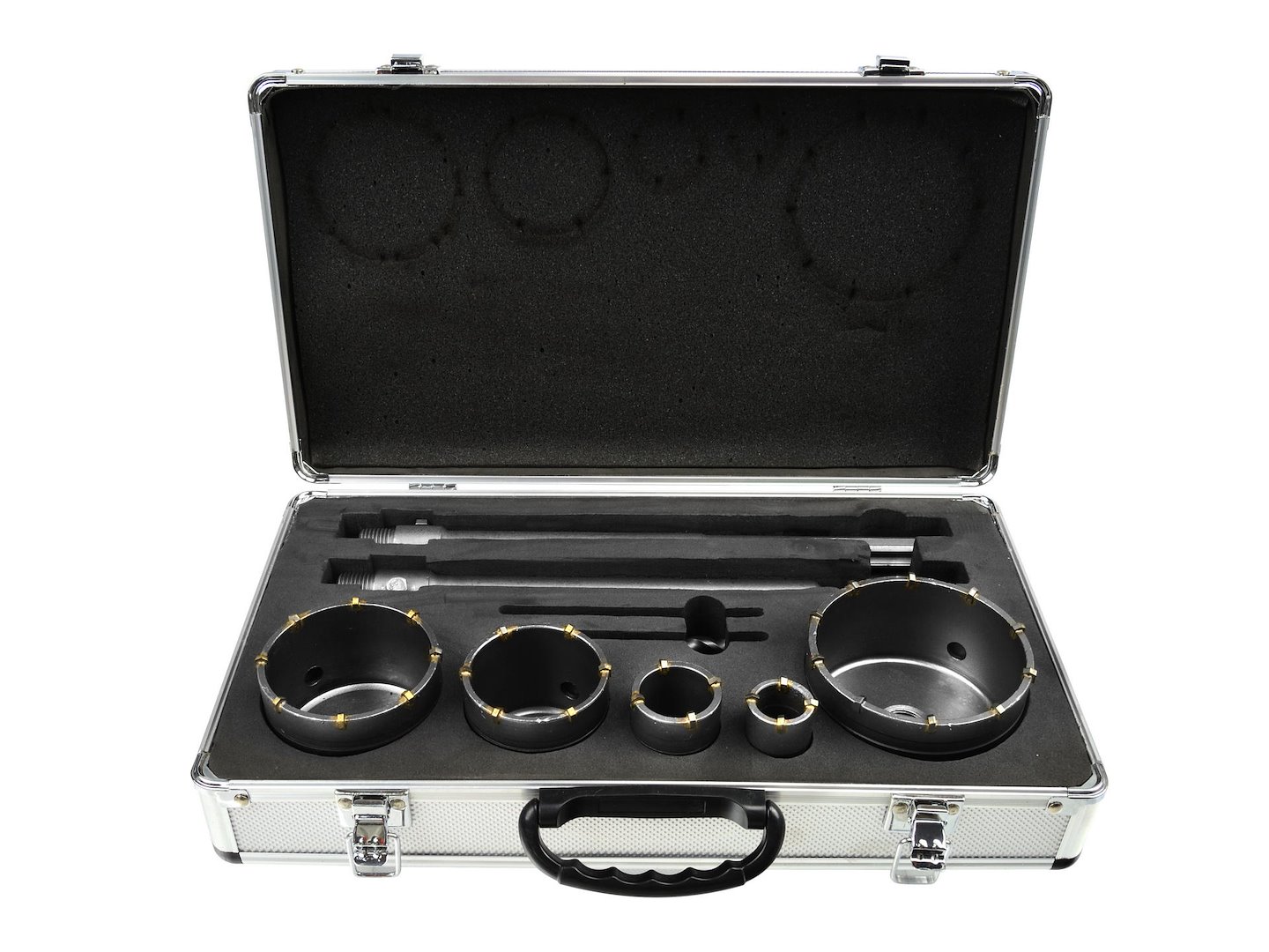 Vďaka tomu môžete túto sadu využiť pre široké spektrum materiálov – od tehly, betónu, cez plastové steny až po sadrokartón či betónové dosky – ideálne na vyrezanie otvorov pre elektrické krabice, zásuvky či inštalačné vedenie. Súčasťou balenia je praktické kovové puzdro, ktoré chráni jednotlivé diely počas prepravy a skladovania, a zabezpečuje, aby nástroje zostali organizované a po ruke. Celková hmotnosť súpravy je približne 4,700 kg.