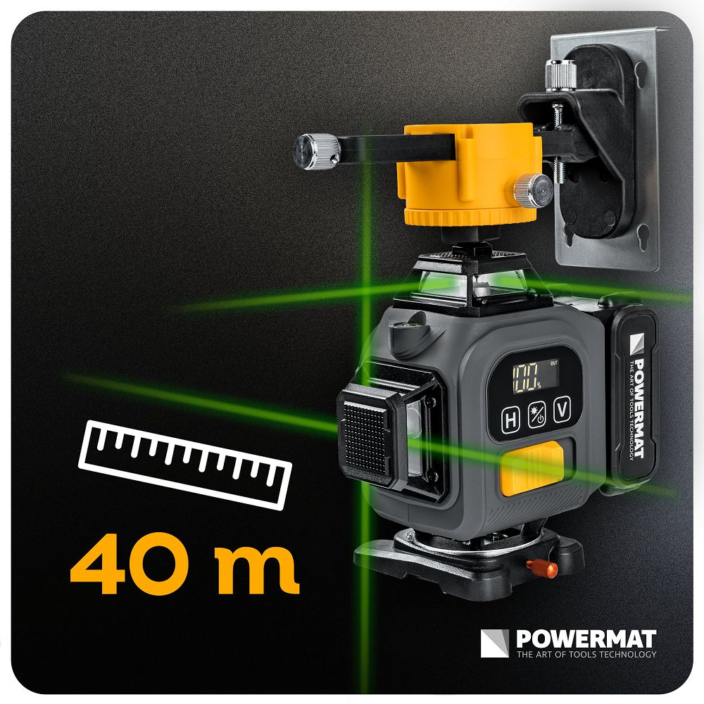 Zelený laser s vysokou viditeľnosťou a kryt IP54 vám umožňujú pracovať v interiéri aj exteriéri. Li-Ion batéria zaisťuje stabilnú prevádzku bez častých prerušení. Presnosť ±1 mm na 10 metrov vám umožňuje udržiavať rovné línie aj na väčšie vzdialenosti. Pracovný dosah až 40 metrov vám umožňuje pracovať vo väčších miestnostiach a otvorených priestoroch. LCD displej na ovládacom paneli zobrazuje aktuálny stav nabitia batérie, takže viete, koľko prevádzkovej doby vám ešte zostáva.