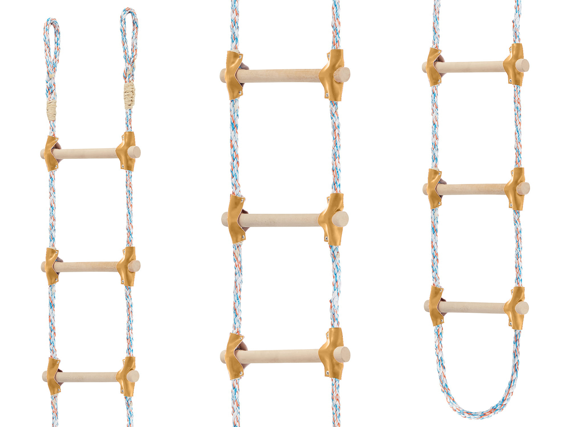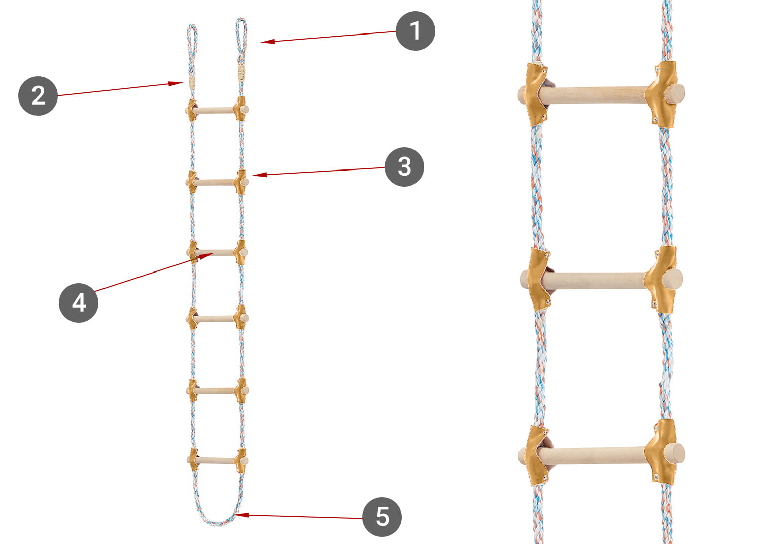 - Špeciálne výstuhy z jutového lana – upevnenia sú dodatočne zaistené chráničmi z jutového lana, ktoré zaisťujú hlavné laná rebríka v dĺžke približne 10 cm.