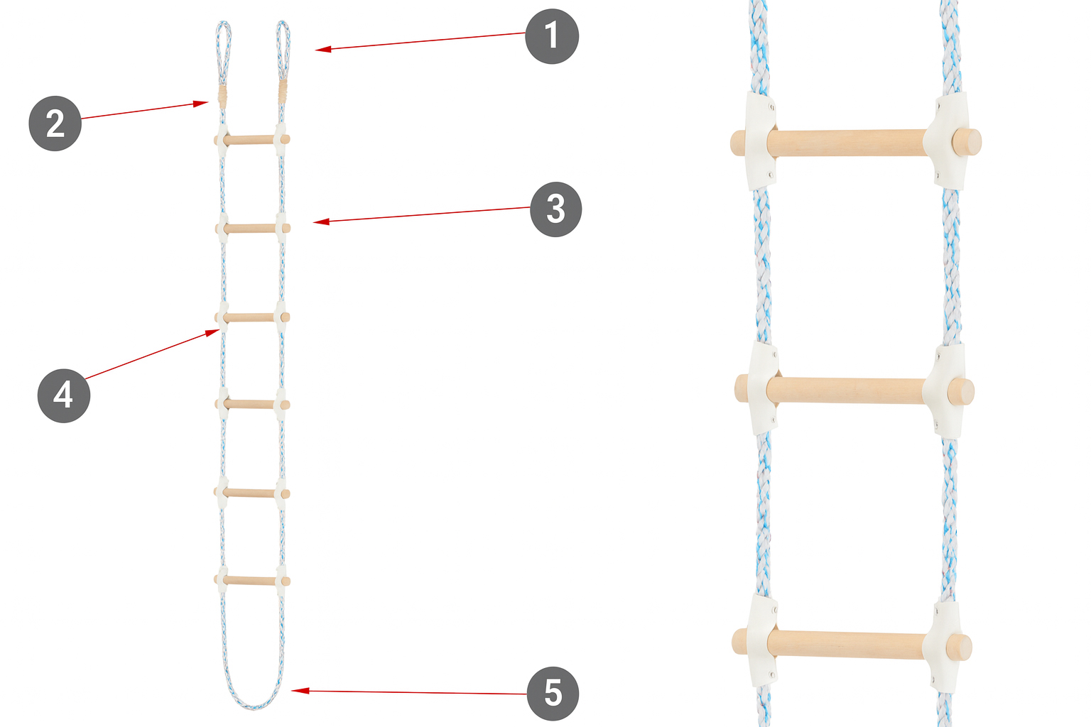 - Spodná slučka – rebrík je zakončený jedinou spodnou slučkou, ktorá dodáva celému rebríku jednotnú štruktúru (vyrobená z jedného kusu lana). Spodná slučka môže slúžiť aj ako takzvaný „prvý priečnik“, na ktorom môžete stáť.