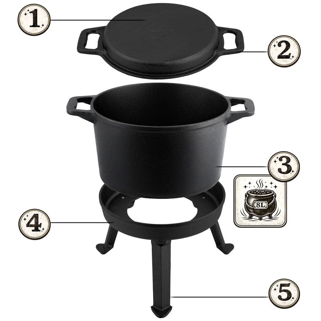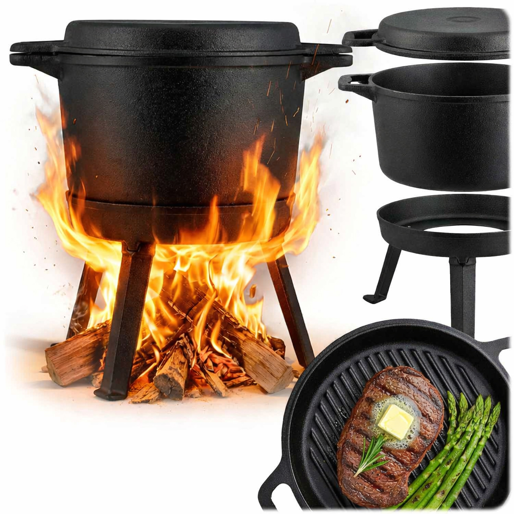 Liatinový kotlík s panvicou 2v1 BD-480, 8L | Berdsen je nádoba vhodná na prípravu jedál v exteriéri, ideálna na rôzne formy varenia na ohni aj grile. Masívna liatinová konštrukcia zabezpečuje rovnomerné rozloženie tepla a jeho dlhé udržanie, čo podporuje efektívne varenie aj pri príprave náročnejších jedál. Materiál odoláva vysokým teplotám a zachováva tvar aj pri dlhodobom používaní.