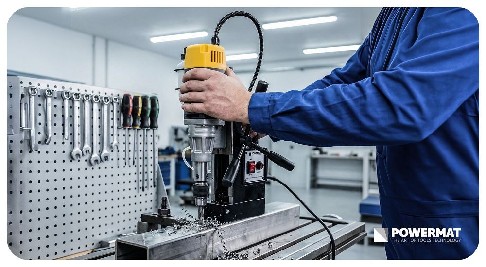 Magnetická vŕtačka, 1500W, 11500N | PM-WM-1500M pre vŕtanie do ocele a kovových konštrukcií, kde nie je vhodné používať ručné alebo stolové zariadenia. Získate stabilné upevnenie, vysoký výkon a presnosť, kratší pracovný čas a možnosť vŕtať vertikálne, horizontálne a nad hlavou. Táto vŕtačka vám poskytuje stabilné upevnenie bez akýchkoľvek problémov. Ušetríte čas, nervy a opravy, pretože náradie zostane presne tam, kde ho potrebujete.