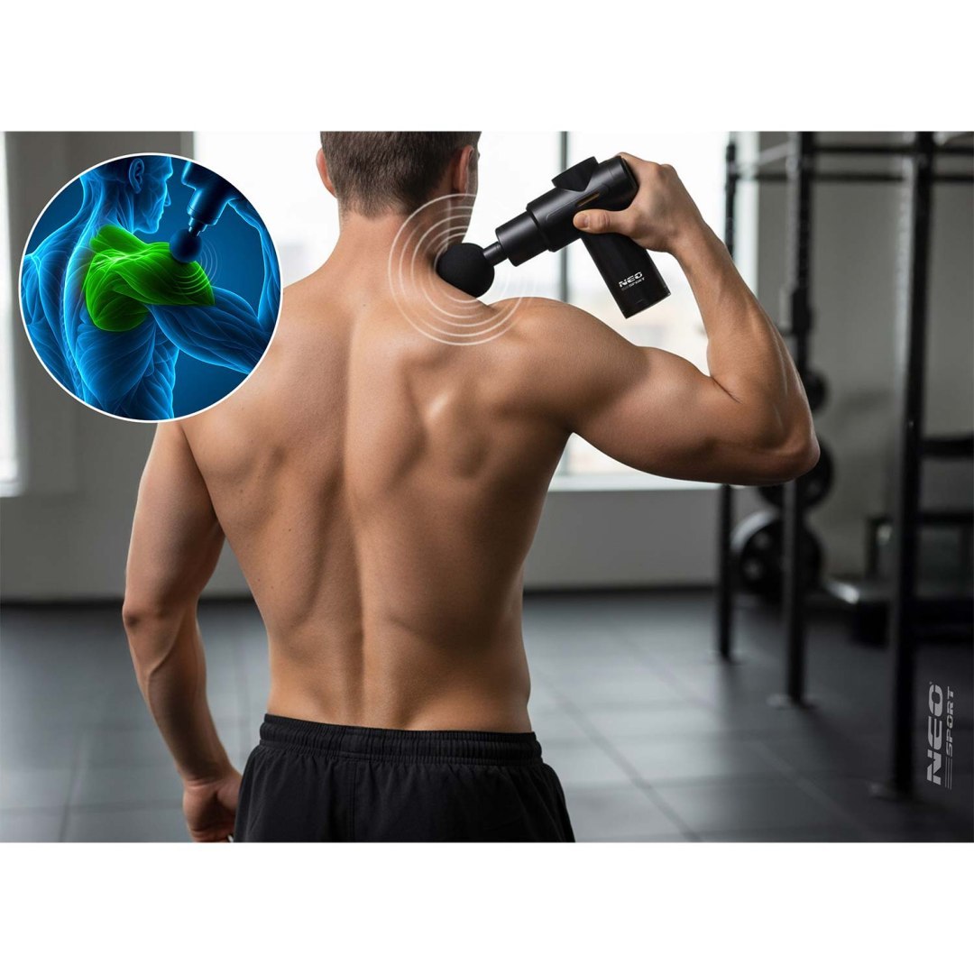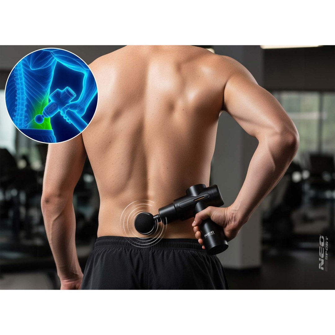 Masážna pištoľ NS-504, 6 nástavcov, čierna | Neo-sport je výkonné zariadenie určené na úľavu od svalového napätia a regeneráciu tela doma aj na cestách. So 6 vymeniteľnými nástavcami pokryjete rôzne oblasti tela. Od chrbta a ramien až po nohy či paže a prispôsobíte masáž konkrétnym svalovým skupinám.