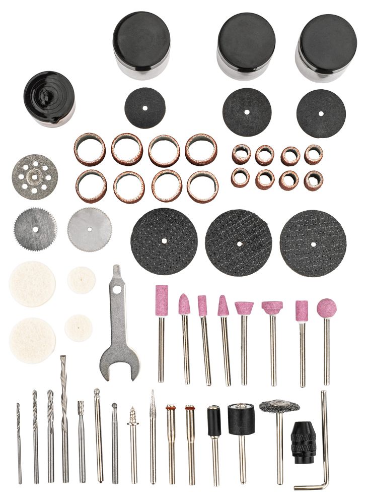 Zariadenie podporuje širokú škálu výmenných nástavcov, ako sú kotúče, frézy, vrtáky, kefy a gravírovacie nástavce. Ľahká výmena príslušenstva vám umožňuje rýchlo prispôsobiť nástroj konkrétnej úlohe, čím sa zvyšuje efektivita a komfort práce. Súprava obsahuje viac ako 180 pracovných príslušenstiev, vrátane fréz, kotúčov, vrtákov, kefiek a brúsnych listov. Vďaka tomu je brúska vhodná na mnoho použití.