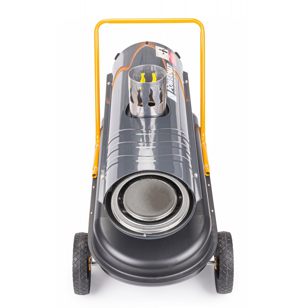 - Plameň ohrieva výmenník tepla a výfukové plyny sú odvádzané von komínom v hornej časti puzdra. Tepelná energia sa prenáša do vzduchu obklopujúceho výmenník a je vyfukovaný z ohrievača vo forme rovnomerného prúdu čistého a horúceho vzduchu.