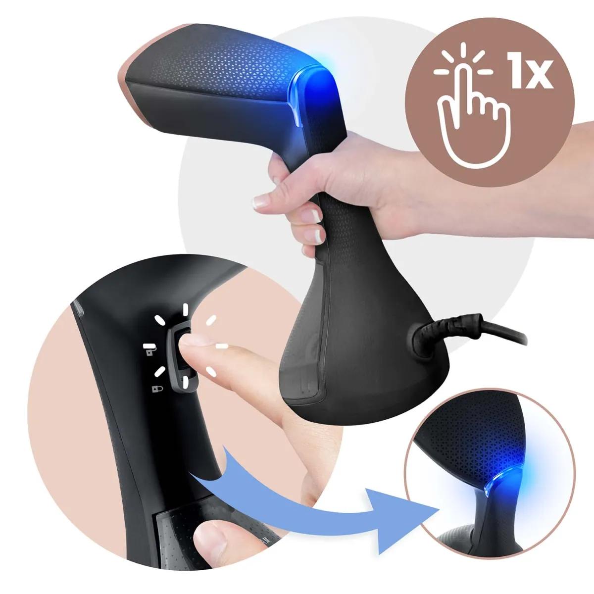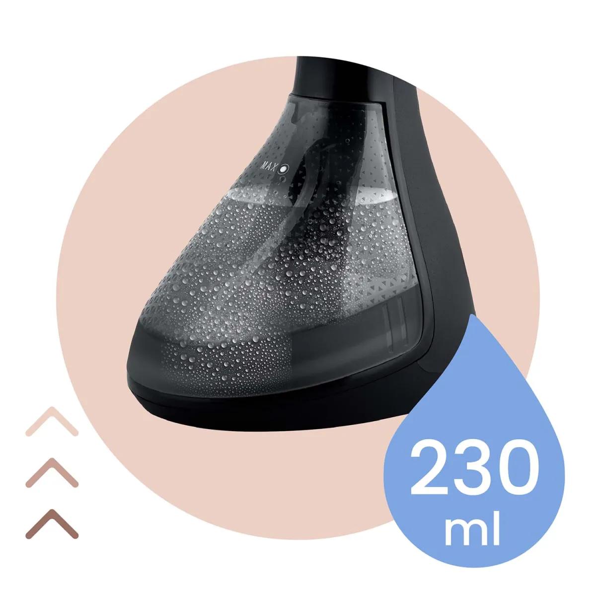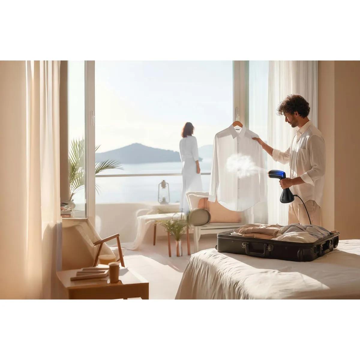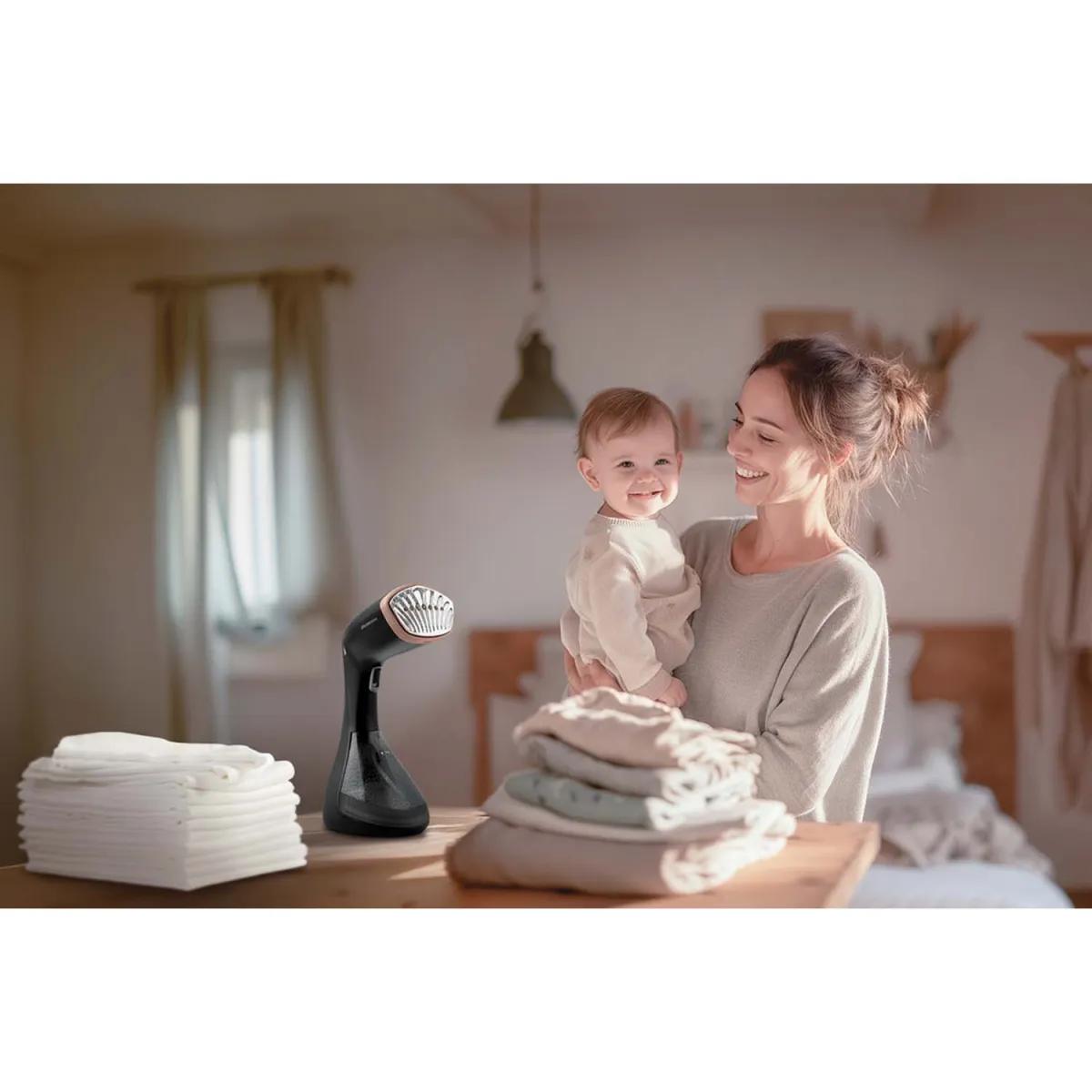 S odnímateľnou nádržkou na vodu o objeme približne 230 ml je možné naraz spracovať viac kusov oblečenia bez nutnosti častého dopĺňania. Zariadenie sa ovláda jednoduchým jediným tlačidlom, obsahuje nastaviteľnú parnú trysku a príslušenstvo ako kefu, čo umožňuje použiť naparovač aj na čalúnenie či tkaniny s vlasom alebo nitkami. Vďaka možnostiam použitia na rôzne textílie a kompaktným rozmerom je ideálnou voľbou pre domácnosti, kde sa požaduje efektívnosť a flexibilita.