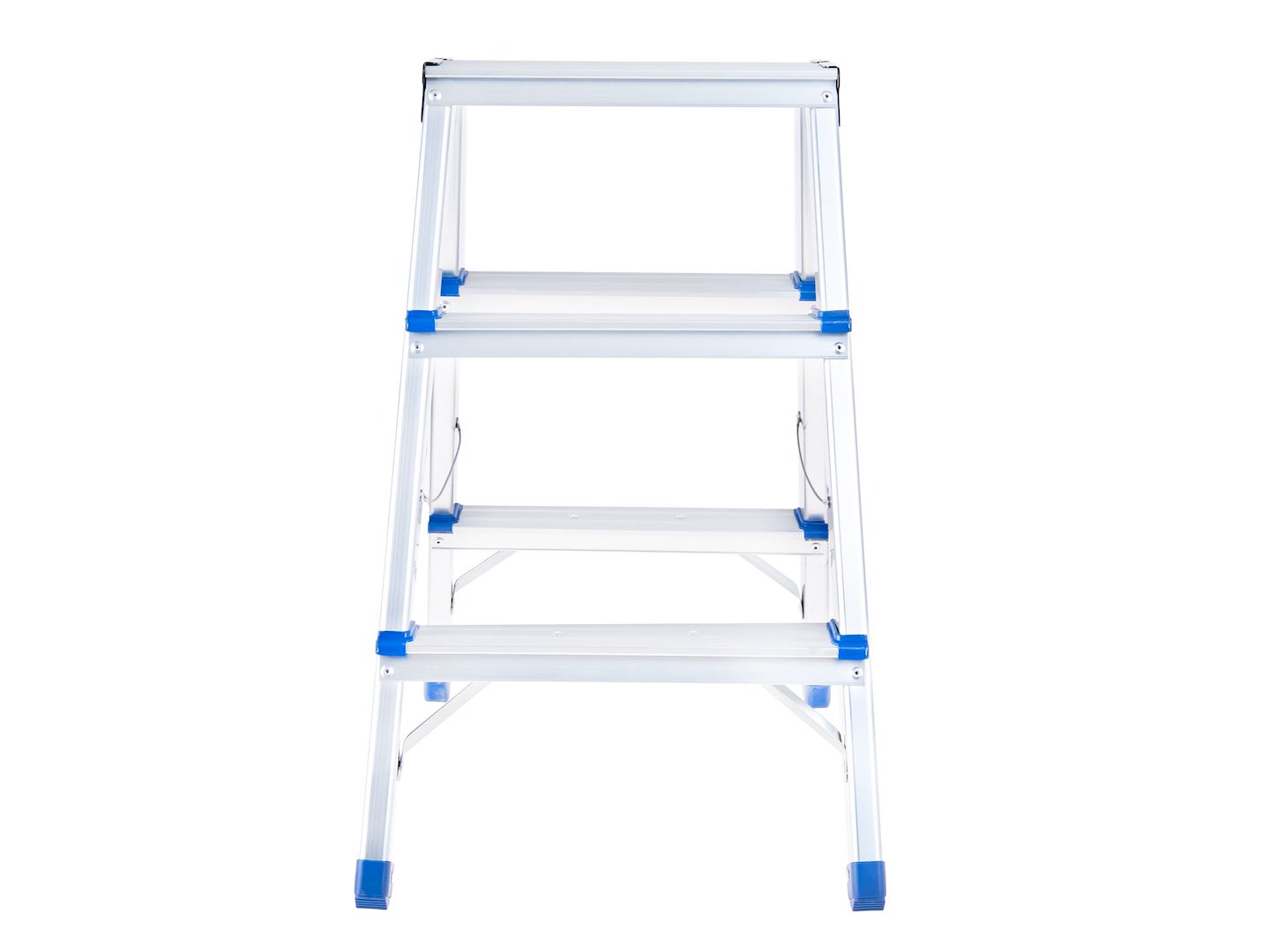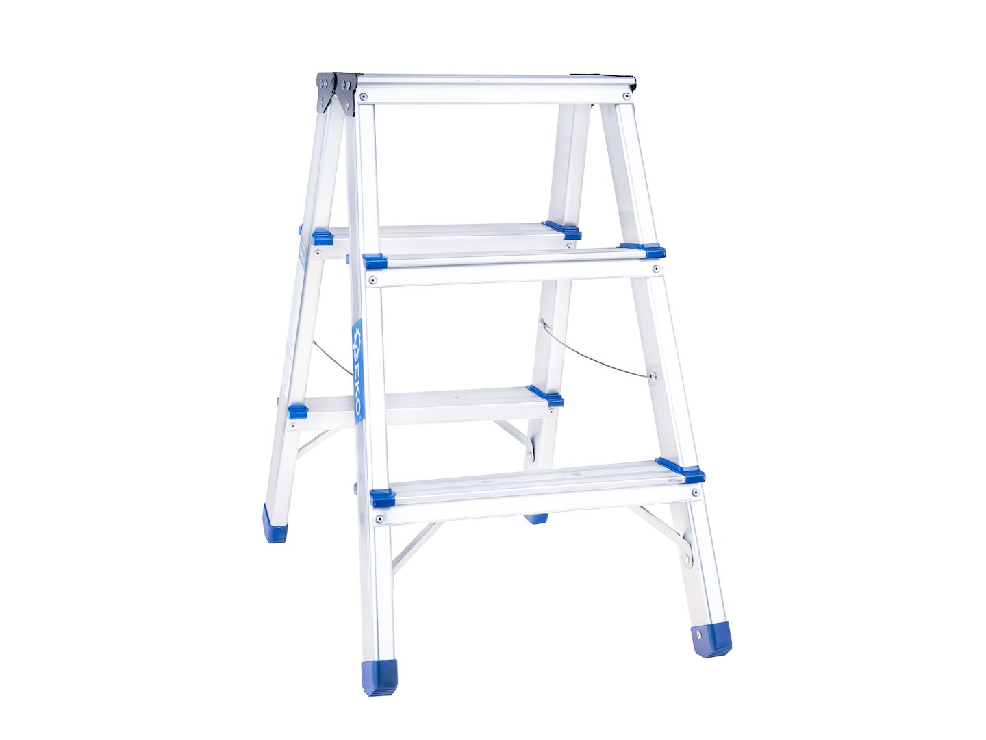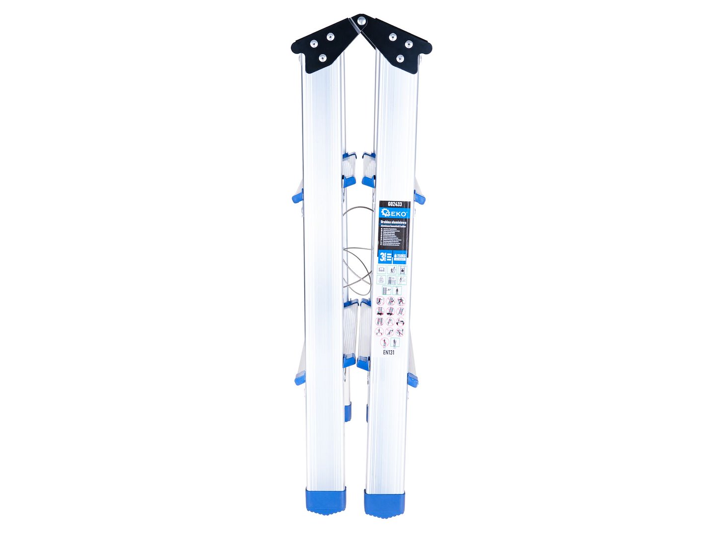 Obojstranný hliníkový rebrík, 3-stupňový, 150 kg | GEKO poskytuje stabilné a praktické riešenie pre prácu v domácnosti aj dielni. Rebrík je ideálnym riešením pre domáce, dielenské aj inštalačné práce. Pracovná výška na úrovni ~2,19 m umožňuje pohodlný prístup k stropom, horným policiam, osvetleniu a iným ťažko dostupným miestam, bez nutnosti používať ťažké, viacdielne konštrukcie.