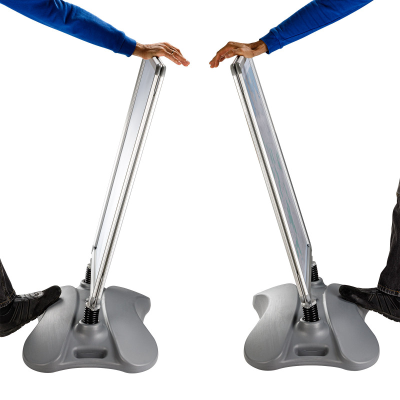 Bočné úchyty a integrované kolieska umožňujú ľahké premiestňovanie stojanu jednoduchým naklonením. Stabilné podpery poskytujú potrebnú flexibilitu vo vetre a nepriaznivom počasí. Vďaka tomu je vhodný na reklamu v interiéri aj exteriéri. Rýchla montáž bez použitia náradia.