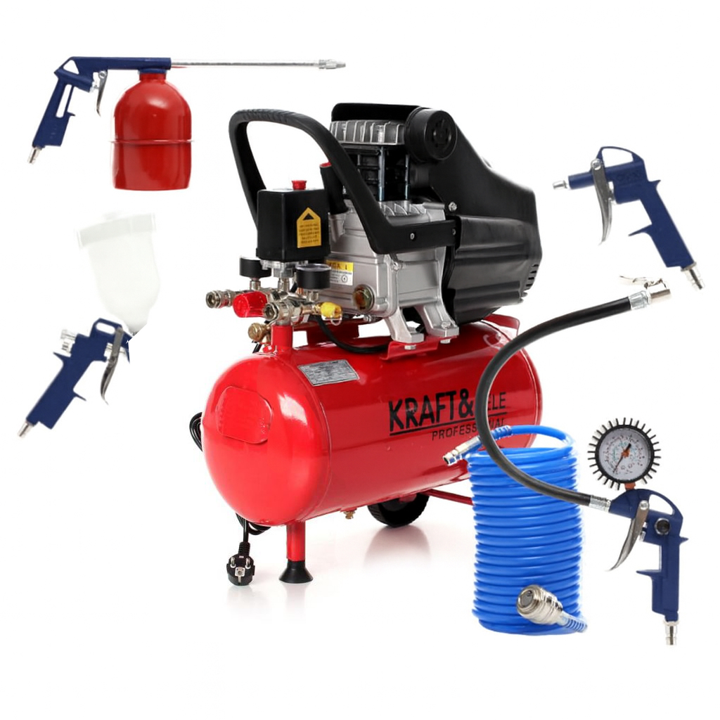 Olejový kompresor s príslušenstvom, 24L | KD400-K3 je univerzálne zariadenie, ideálne pre profesionálne dielne aj pre nadšencov domáceho majstrovania. Kompresor je vybavený výkonným jednovalcovým motorom s výkonom 3,8 HP, ktorý umožňuje efektívnu prevádzku s väčšinou pneumatických zariadení – na maľovanie, čistenie alebo fúkanie.