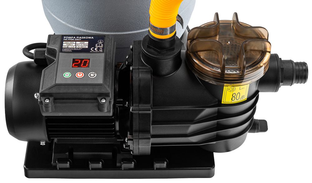 Pieskové čerpadlo, 250W | PM-PPDB-250JT zabezpečuje neustálu filtráciu a cirkuláciu vody, vďaka čomu je ľahšie udržiavať bazén čistý počas celej sezóny. Výkon 7 900 l/h a pieskový filter účinne zachytávajú nečistoty, zatiaľ čo manometer a 7 prevádzkových režimov vám umožňujú rýchlo kontrolovať filtráciu a obmedziť ručné čistenie vody. Motor s výkonom 250 W udržiava stabilný obeh vody v inštalácii. Filtrácia funguje rovnomerne po celý deň.