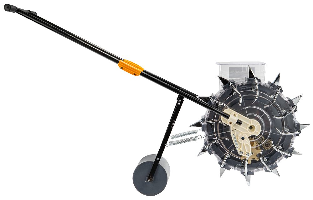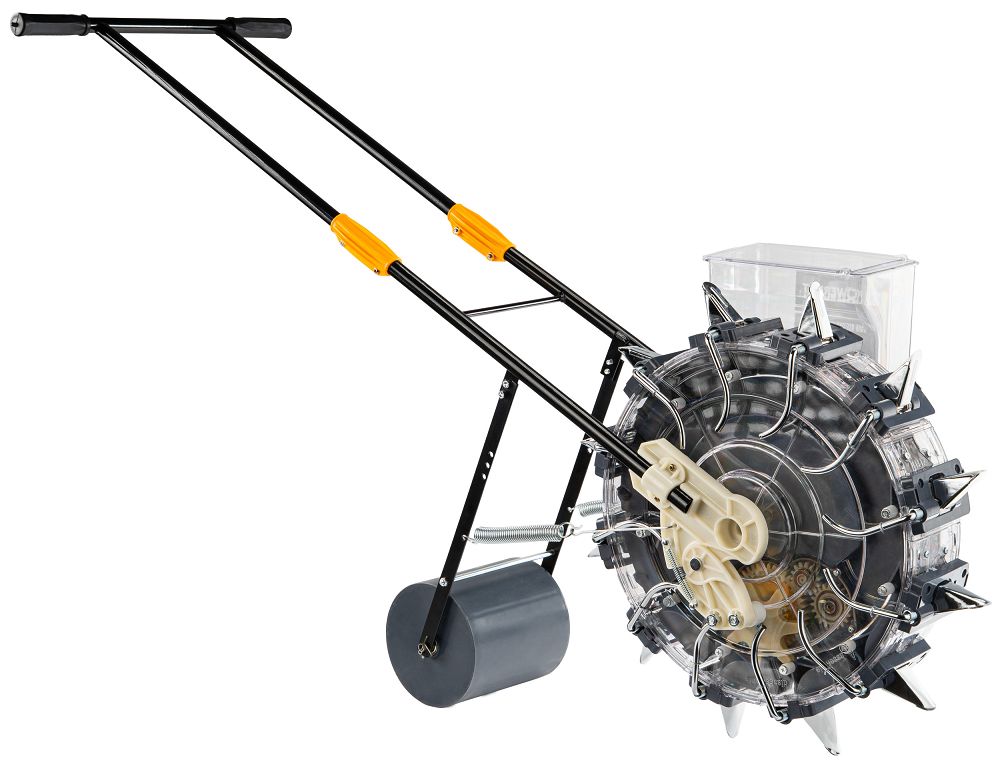 Konštrukcia zabezpečuje stabilné vedenie stroja po pôde, čo sa prejavuje rovnomerným výsevom. Pritlačový valec zodpovedá za utlačenie pôdy po výseve, vďaka čomu majú semená lepší kontakt s podložím a rovnomerné podmienky na klíčenie. Objem 3,7 kg vám umožňuje pracovať dlhšie bez častého dopĺňania semien, čo reálne urýchľuje celý proces výsevu. Priehľadná nádrž vám poskytuje plnú kontrolu nad hladinou, vďaka čomu neprerušujete prácu v neočakávanom momente.
