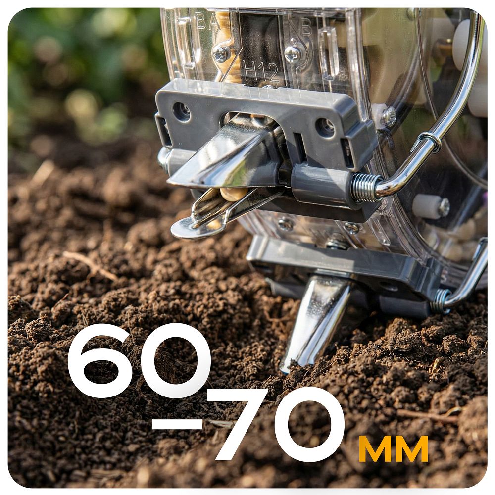 Nastavujete hĺbku a rozstup, takže prispôsobíte výsev kukurici, fazuli, hrachu alebo sóji. Získate univerzálny nástroj pre rôzne plodiny bez nutnosti výmeny zariadenia. Sejačka vysieva 1–2 semená v rovnakých rozostupoch, vďaka čomu majú rastliny optimálne podmienky na rast. Dosiahnete menšie straty materiálu a predvídateľnejšie výsledky bez opravovania riadkov. Možnosť nastavenia hĺbky 60–70 mm vám umožňuje prispôsobiť výsev typu pôdy a osiva.