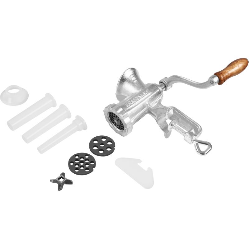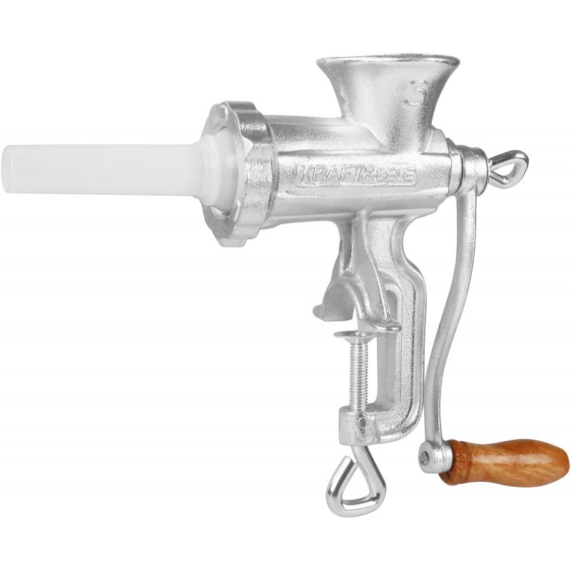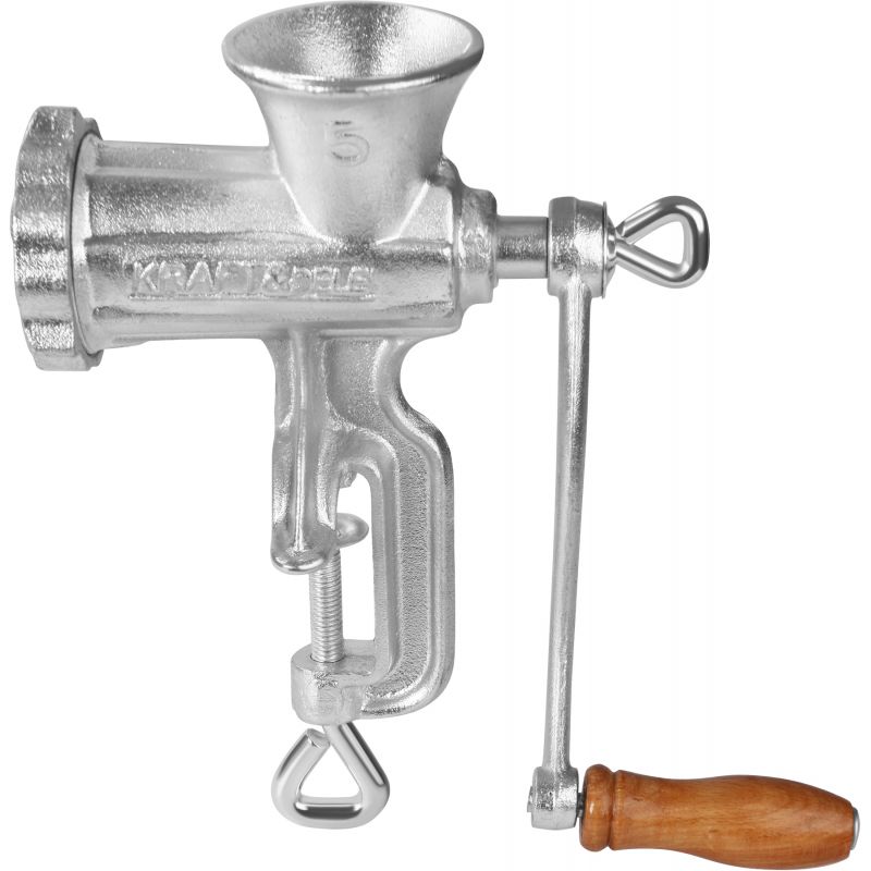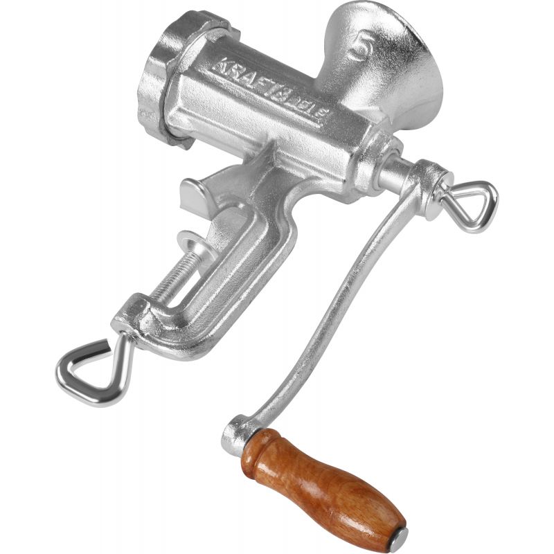 Ručný mlynček na mäso, veľkosť 5 | KD4190 je spoľahlivý a praktický nástroj určený na prípravu čerstvého mäsa, plniek a domácich údenín. Vďaka klasickej konštrukcii a nezávislosti od elektrického napájania sa osvedčí v každej kuchyni. Telo vyrobené zo zliatiny pozinkovaného liatinového kovu zaisťuje trvácnosť a odolnosť voči poškodeniu, a pohodlná kľuka s drevenou rukoväťou zaručuje komfort pri používaní.