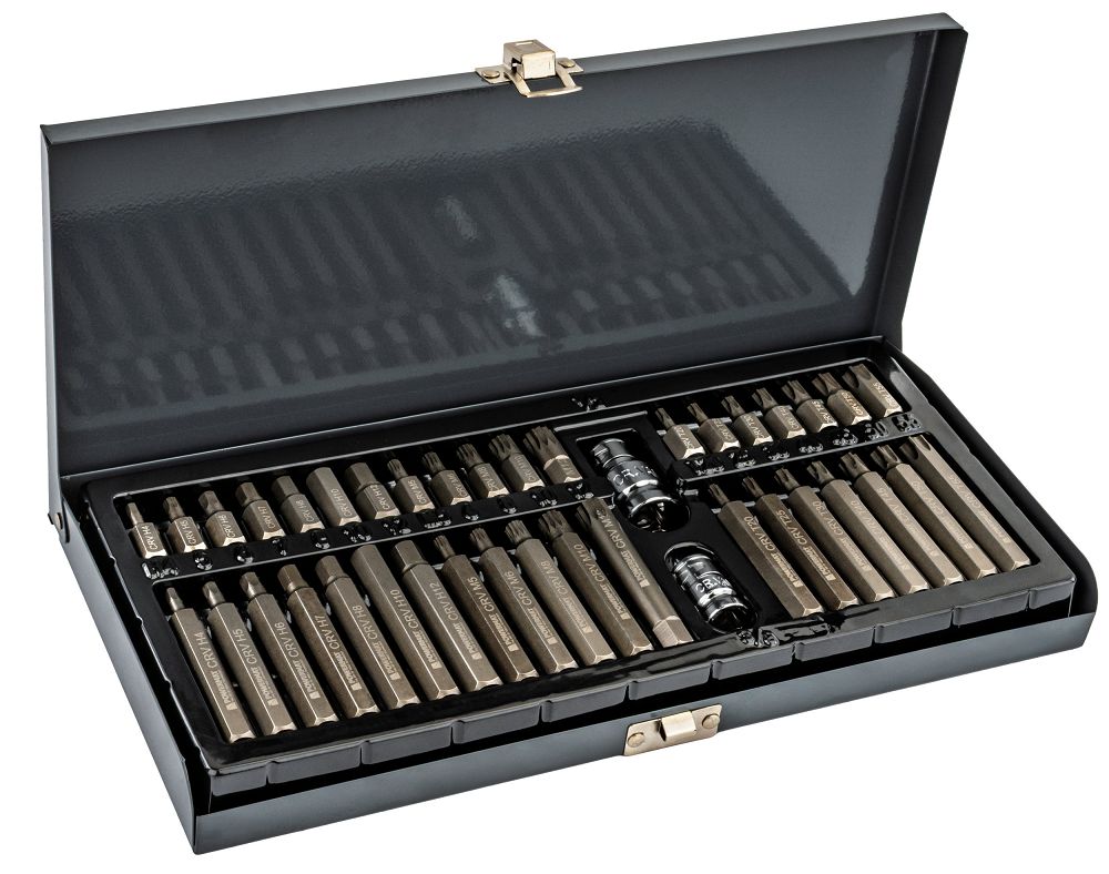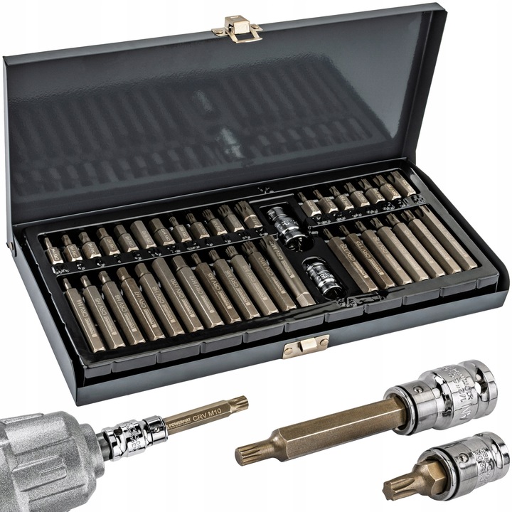 Máte k dispozícii HEX, TORX a SPLINE, čo vám umožňuje prispôsobiť bit rôznym štandardom skrutiek. Môžete pracovať bez rizika poškodenia objímky. S jednou sadou môžete pracovať s rôznymi konštrukciami a spojmi. Adaptéry 1/2„ a 3/8“ vám poskytujú flexibilitu pri práci s rôznymi nástrojmi. Pevné puzdro udržiava sadu usporiadanú a uľahčuje jej prepravu, takže máte vždy všetko pod kontrolou.