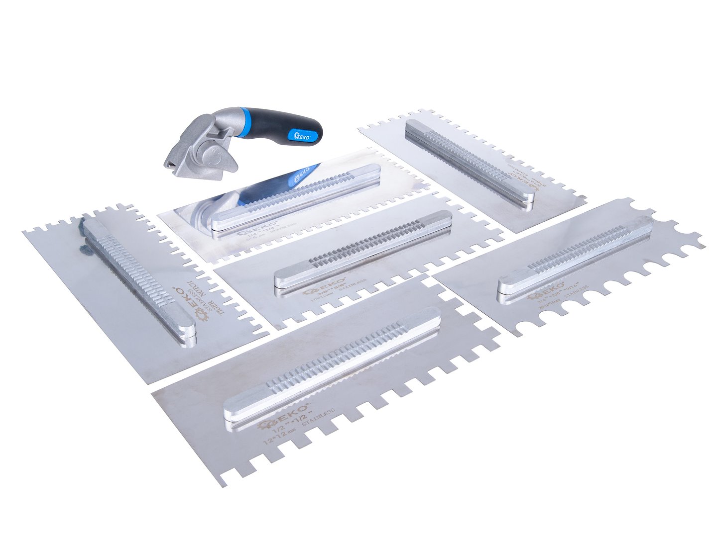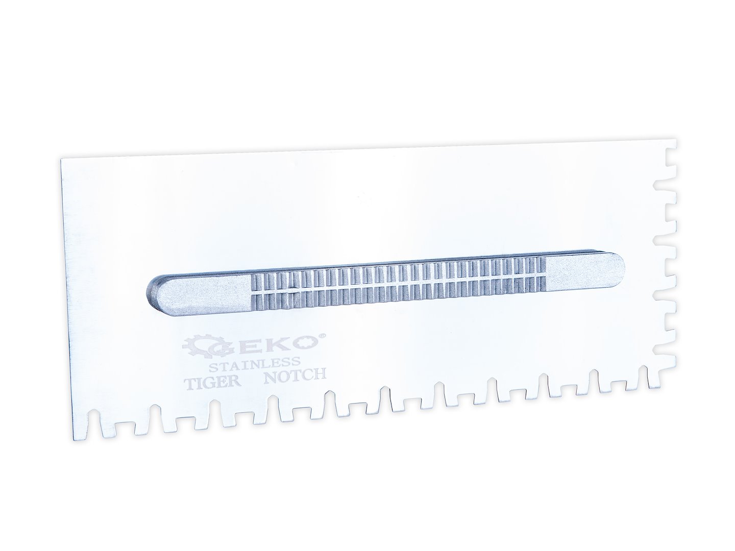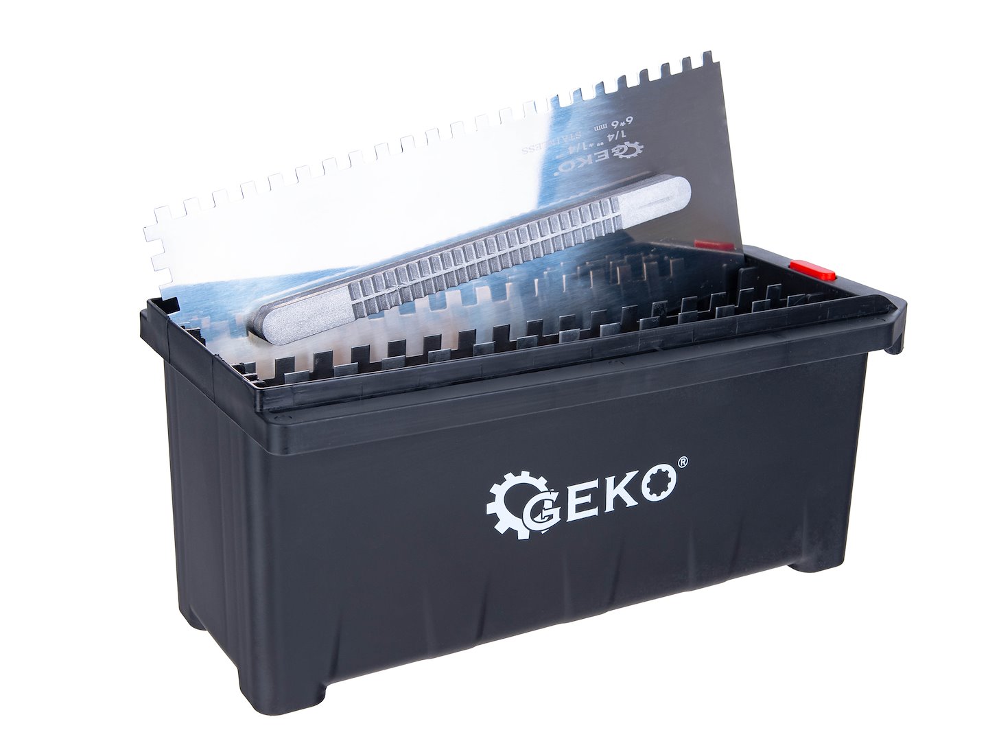 Sada na nanášanie lepidla pod dlaždice, 280x115mm | GEKO obsahuje potrebné nástroje, ktoré zjednodušuja každodennú prácu obkladača. V sade nájdete 6 vymeniteľných hrebeňov s rôznymi typmi zubov, rýchloupínacie držadlo a praktickú prepravnú krabicu. Každá stierka má rozmery 280 x 115 mm, vďaka čomu sú ideálne pre väčšie aj menšie povrchy.