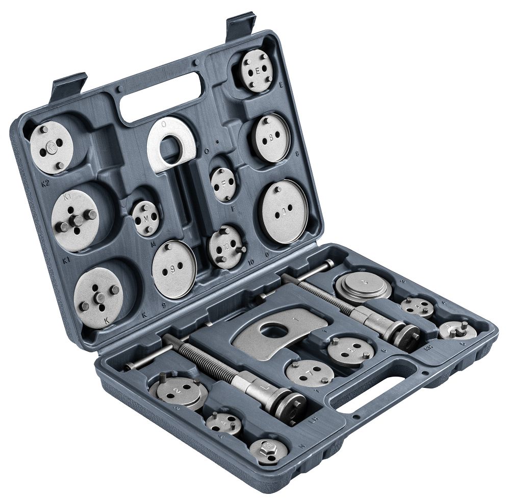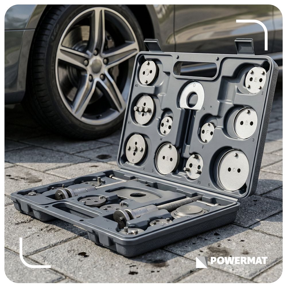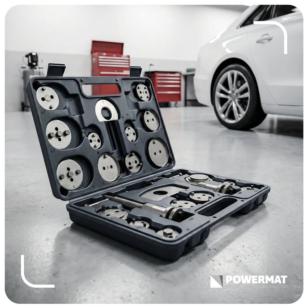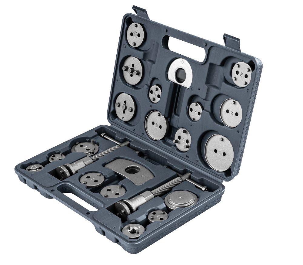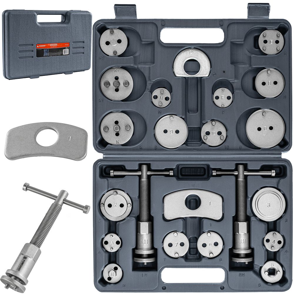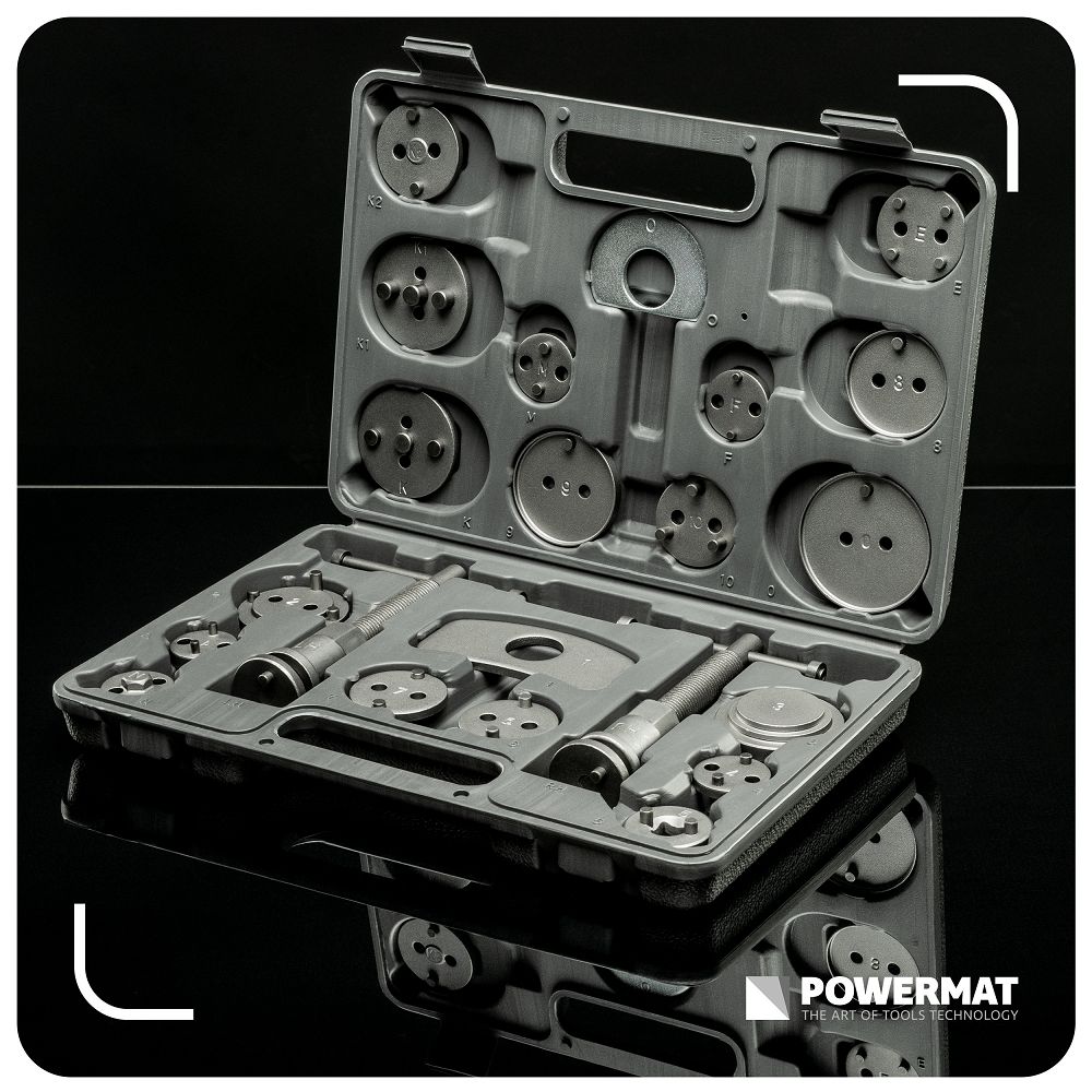 Sada na zatláčanie brzdových piestov, 22ks | PM-ZWT-22T obsahuje nástroje na vytláčanie piestov pri výmene brzdových doštičiek. Vďaka mnohým adaptérom prispôsobíte náradie rôznym modelom. Pravotočivé a ľavotočivé lisy zvyšujú pohodlie pri práci. Získate presnosť, úsporu času a menšie riziko poškodenia. Pravý a ľavý závit vám umožňuje pracovať v súlade s konštrukciou piestu bez rizika poškodenia. Vďaka tomu vykonávate servis presne a bez zbytočnej námahy.