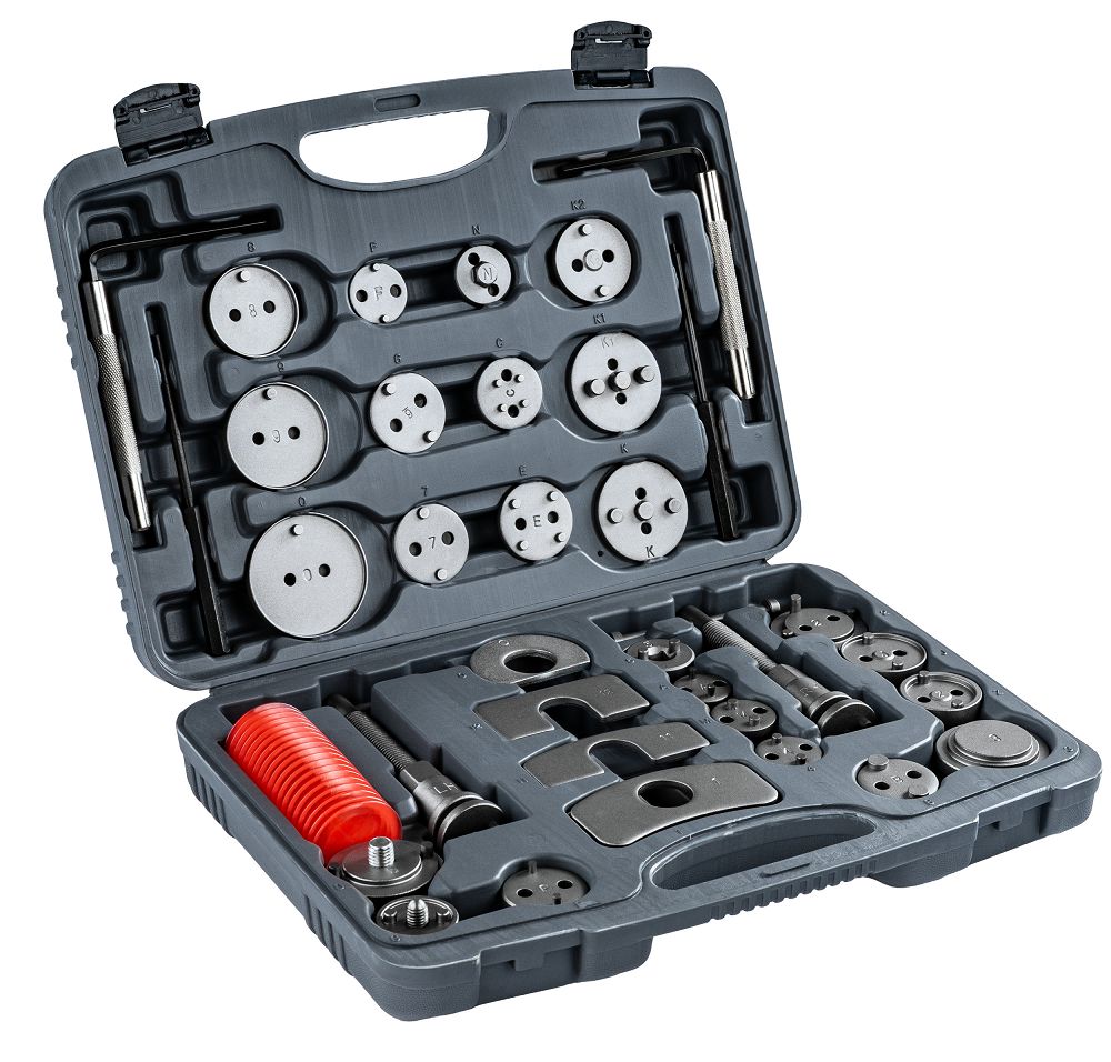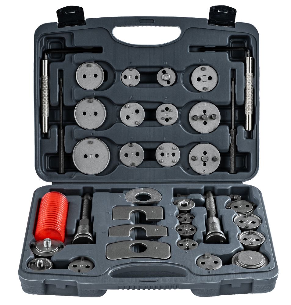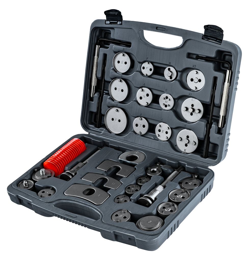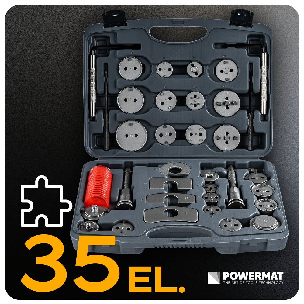 Sada na zatláčanie brzdových piestov, 35ks | PM-ZWT-35T obsahuje praktické nástroje na servis brzdového systému vo vašom aute. Vďaka 35 dielom, vrátane adaptérov a lisov na pravú a ľavú stranu, ju prispôsobíte mnohým modelom. Získate presnú prácu, jednoduchšiu montáž brzdových doštičiek a úsporu času bez rizika poškodenia. Vďaka 28 adaptérom bez problémov prispôsobíte náradie rôznym brzdovým strmeňom. Získate univerzálne riešenie a nestrácate čas kombinovaním s nevhodnými dielmi.