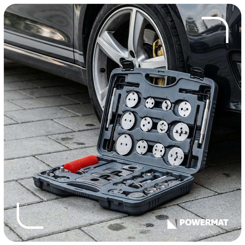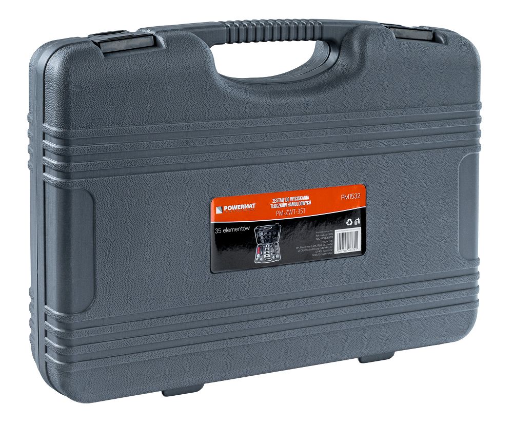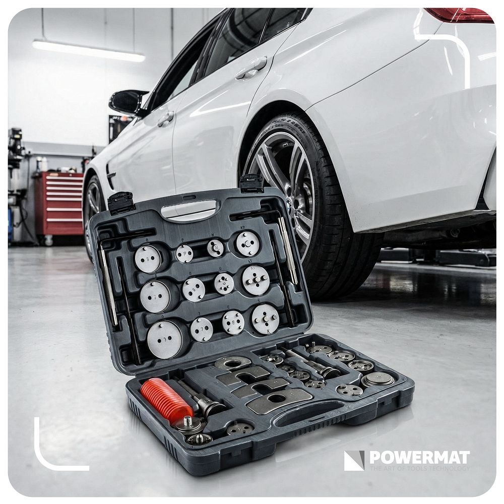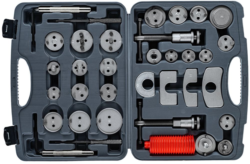 Sada na zatláčanie brzdových piestov, 35ks | PM-ZWT-35T obsahuje praktické nástroje na servis brzdového systému vo vašom aute. Vďaka 35 dielom, vrátane adaptérov a lisov na pravú a ľavú stranu, ju prispôsobíte mnohým modelom. Získate presnú prácu, jednoduchšiu montáž brzdových doštičiek a úsporu času bez rizika poškodenia. Vďaka 28 adaptérom bez problémov prispôsobíte náradie rôznym brzdovým strmeňom. Získate univerzálne riešenie a nestrácate čas kombinovaním s nevhodnými dielmi.