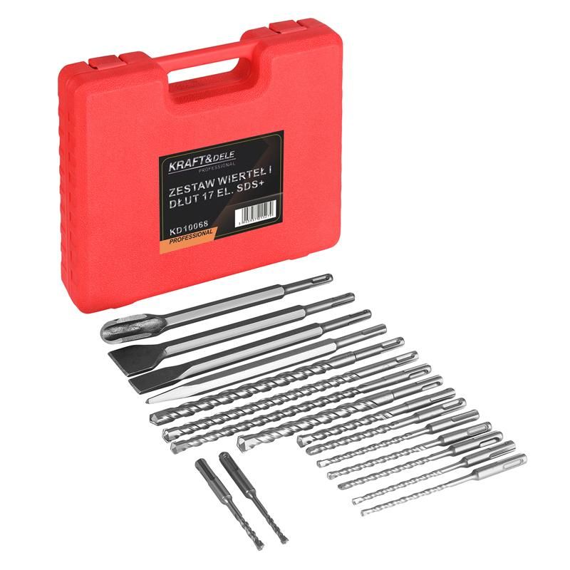 Sada vrtákov a dlát SDS+, 17ks | KD10068 je univerzálny dielenský set vhodný na vrtanie a sekanie do betónu, tehál či kameňa. Sada obsahuje rôzne vrtáky do betónu a sekáče, ktoré sú vhodné ako pre profesionálne dielne, tak aj pre domáce použitie. Celá sada je zabalená v pevnom kufríku pre jednoduché skladovanie a prepravu.