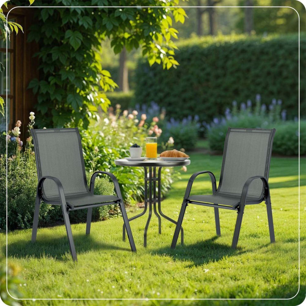 Ergonomický tvar a kvalitné materiály zabezpečujú, že stoličky poskytujú maximálne pohodlie aj pri dlhšom sedení. Pevný oceľový rám dodáva konštrukcii stabilitu a vysokú nosnosť. Priedušný textilný poťah odoláva poveternostným vplyvom, umožňuje jednoduché čistenie a prispieva k celkovému komfortu pri používaní.